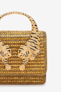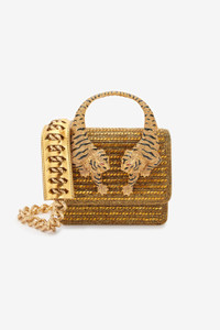 ID: SKB025-PZC98-00139 A riot of small all-over crystals gives life to slim golden rows and lights up this regal mini bag. The model is made even more distinctive by the two elegant tigers that make up the handle, which pays homage to Roberto Cavalli's roaring feline spirit. The accessory, which has a flap fastening, comes with a finely-crafted chain strap that can be removed with the clasps, allowing it to be carried by hand or over the shoulder. Details - Measures 15,5x13x7 cm cm Care & maintenance Leather - Fur:Bos Taurus / External fabric:69% Polyurethane, 31% Polyester / Lining:56% Polyurethane, 44% Polyester