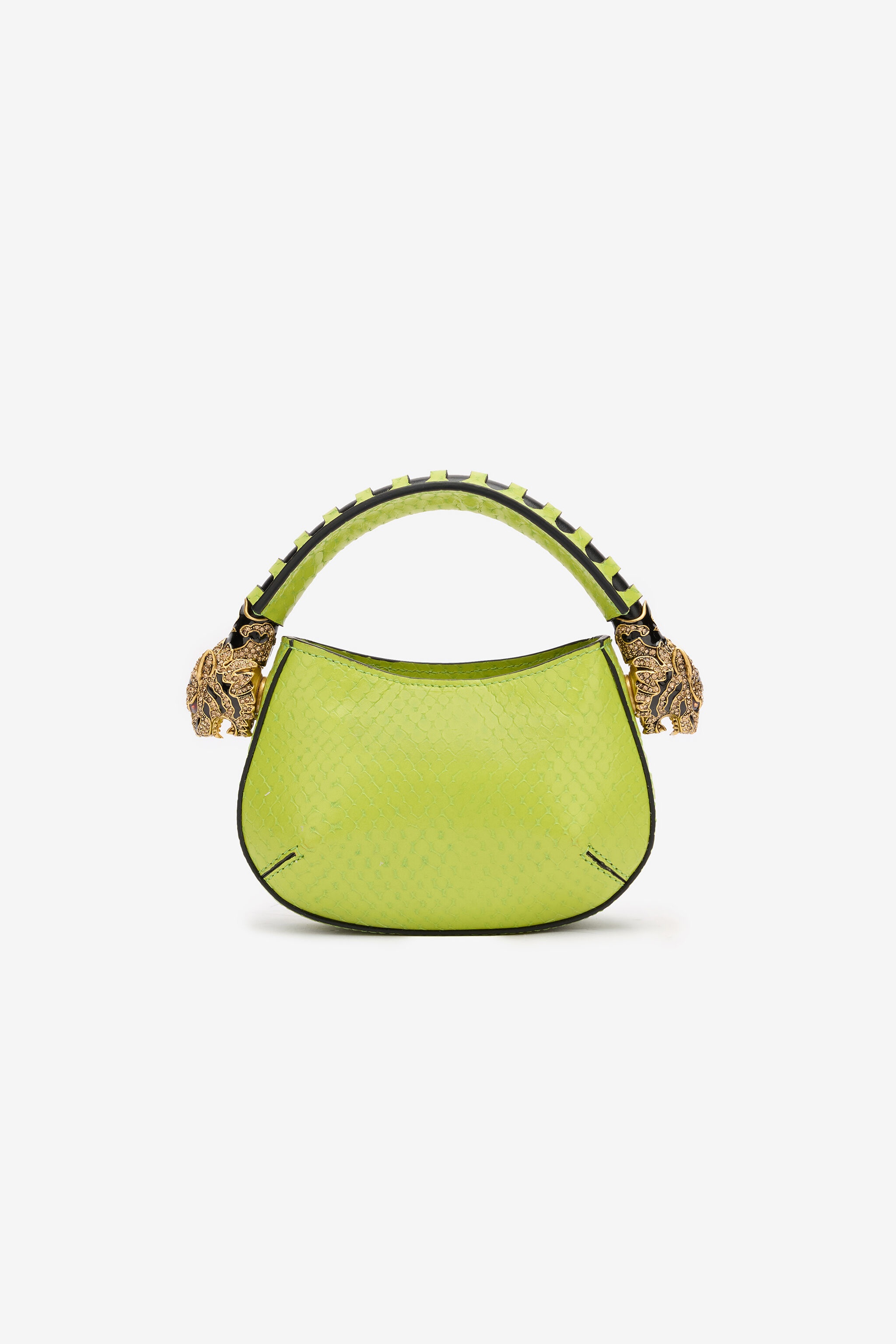 ID: TWB003-PZV98-D0113 A mini representation of the Maison's most captivating stylistic details, this hobo bag is crafted from genuine leather with snake scale-effect embossing and is finished with the signature Roberto Cavalli logo on the front. The accessory, which has an interior enhanced by the unmistakable Jaguar Skin print, is complemented by a top handle with two crystal-studded tiger heads embellishing the ends. Details - Snake scale-effect leather hobo bag - Mini size - Top handle with bejeweled tiger heads on tips - Roberto Cavalli logo on the front - Top opening - Inner rings to attach a shoulder strap - Lining with Jaguar Skin print Care & maintenance Leather - Fur:Bos Taurus / Lining:97% Cotton, 3% Elastane