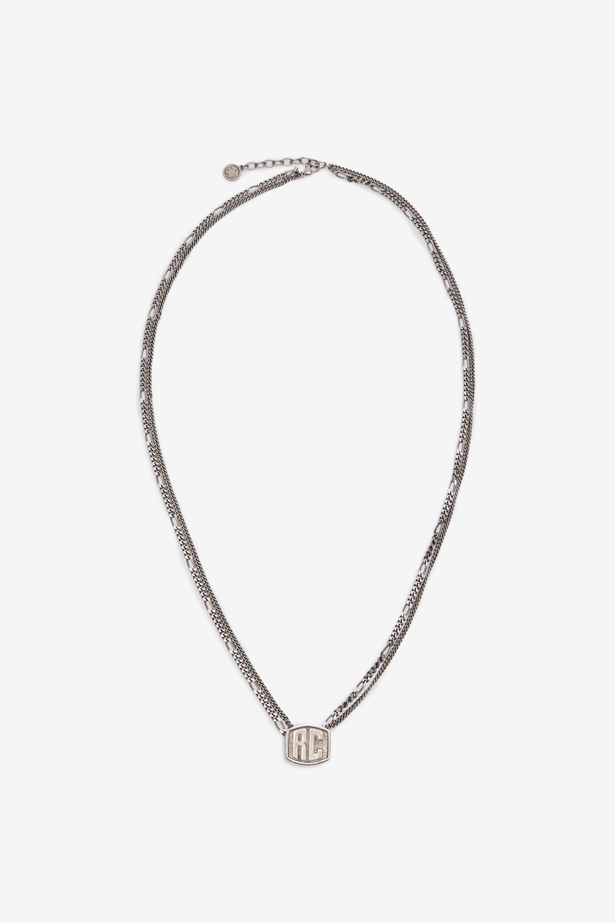 ID: VRG001-AM258-05626 Roberto Cavalli has designed a long necklace inspired by urban aesthetics, characterized by two thin chains that converge in the RC monogram pendant with a sturdy appearance and an eye-catching hammered finish. Details - Necklace with a long design - Thin double chain - RC monogram pendant with hammered finish - Circular medallion with Mirror Snake Monogram on one side and Roberto Cavalli logo on the other - Adjustable fastening with clasp