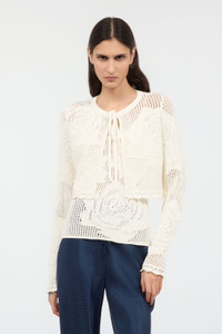 ID: UKM903-MI001-00052 The perfect combination of luxury and refinement, this cropped cardigan from Roberto Cavalli features an open design with a tie on the front and is embellished with an elegant openwork texture, scalloped finishes and a romantic rose motif. The style is finished by the small gold metallic RC Monogram on the back, a further tribute to the brand's identity. Details - Open cropped cardigan - Crew-neck with tie lace - Openwork texture with rose design - Long sleeves - Scalloped hems Care & maintenance External fabric:83% Viscose / Rayon, 17% Polyester