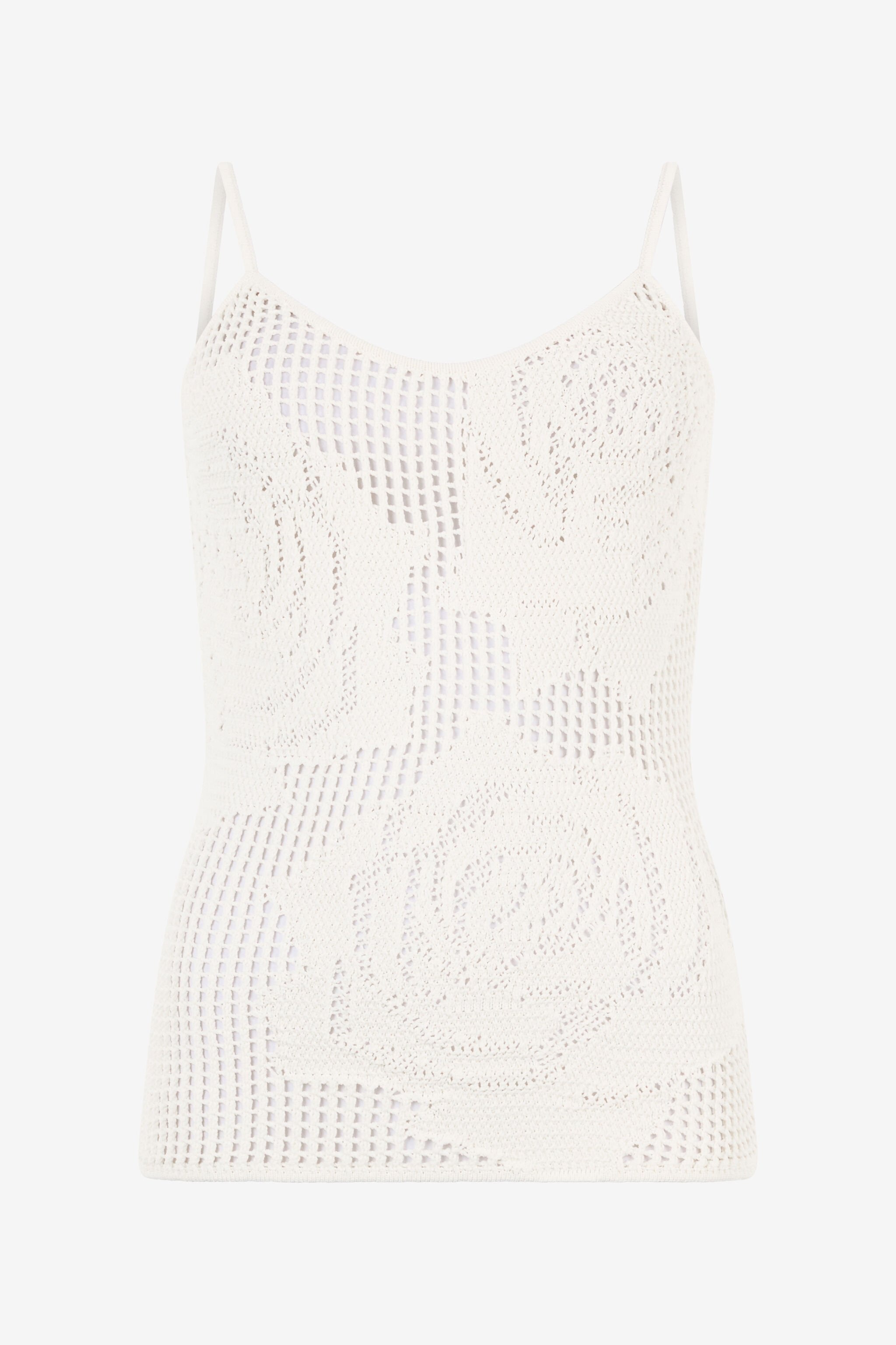 ID: UKM604-MI001-00052 This refined Roberto Cavalli top with slim straps stands out with its openwork texture and romantic rose motif. The style is finished by the small gold metallic RC Monogram on the back, a further tribute to the brand's identity. Details - Top with thin shoulder straps - Openwork texture with rose design - Golden metallic RC monogram on the back Care & maintenance External fabric:83% Viscose / Rayon, 17% Polyester