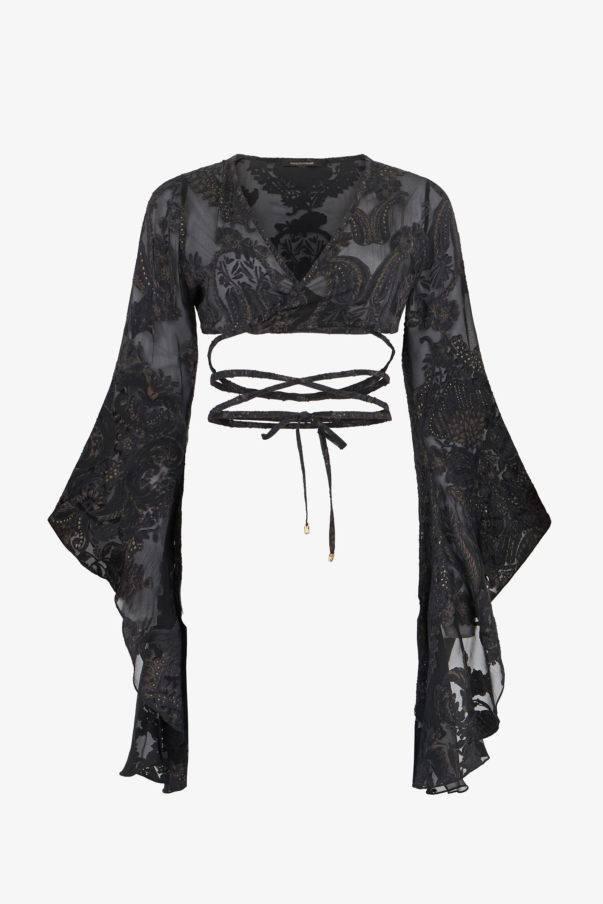 ID: WKW024-SLR36-05051 Let yourself be wrapped in the elegance of this semi-sheer top, featuring crisscross ties that highlight your silhouette. The wide sleeves add a dramatic touch, making it perfect for an unforgettable evening. Details - Captivating all-over floral motif - Silhouette enhanced by crisscross ties - Voluminous sleeves for a dramatic touch - Lightweight, semi-sheer fabric