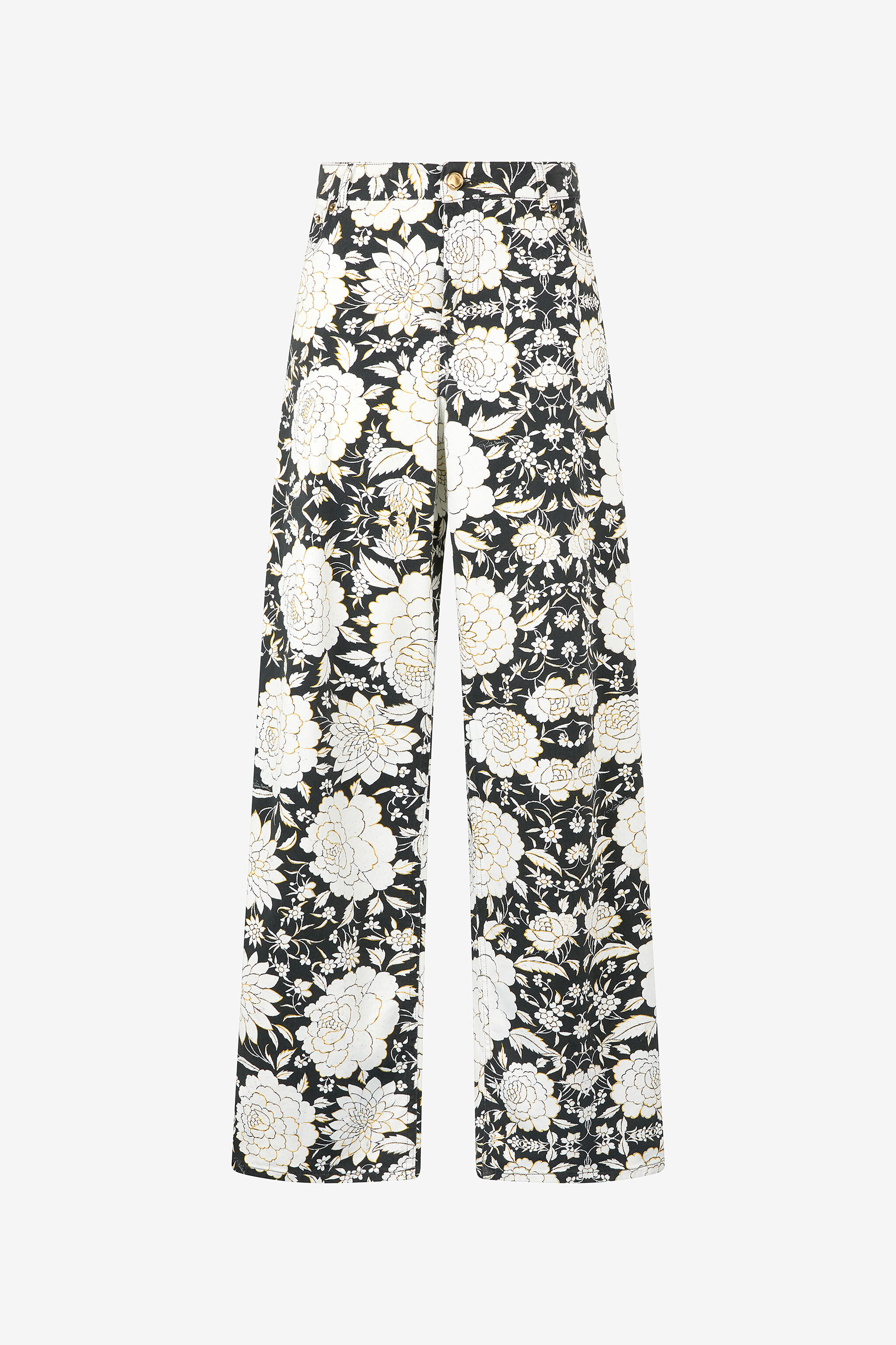 ID: VQJ207-DAP71-D0477 A refined all-over floral print enhances these stretch cotton denim pants by Roberto Cavalli, perfectly blending versatility with contemporary luxury. The tight fit at the waist with flared cuffs makes them perfect for adding a touch of romantic luxury to any look. Details - Stretch cotton denim pants - All-over floral print - Convenient front and back pockets - Tight cut at the waist that loosens towards the hem - Belt loops - Branded metal rivets - Branded tag on back