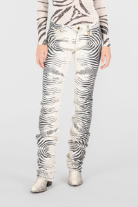 ID: UKJ220-DAN49-D0027 The iconic White Tigress print, an expression of Roberto Cavalli DNA, is the star of these pants with a slightly flared leg, which are perfect for adding a touch of wild sophistication to your closet. Details - Stretch cotton pants with White Tigress print - Five-pocket design - Belt loops - Golden charm with RC Monogram on a belt loop - Slightly flared leg - Branded tag on back - Lined model - Zipper and button fastening Care & maintenance External fabric:98% Cotton, 2% Elastane / Lining:65% Polyester, 35% Cotton