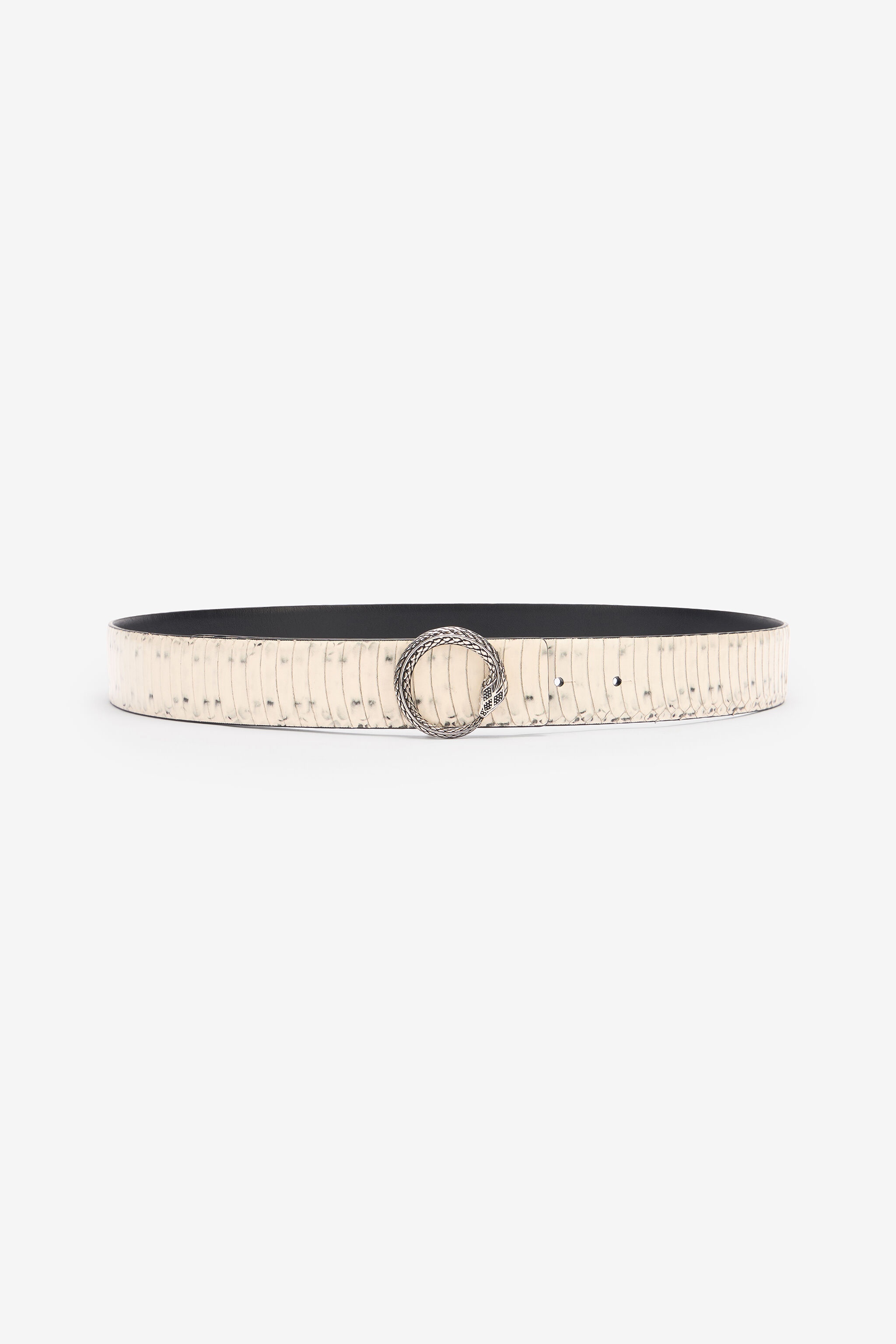 ID: URC001-PZ587-D0817 Crafted from soft leather, this belt by Roberto Cavalli stands out with its slightly distressed and wild look, created by the original all-over cobra print. The reptilian universe is also honored by the buckle, consisting of a silver-tone snake with richly embellished scales that joins head and tail to form a circle. Details - Leather belt with cobra print - Snake-shaped buckle - Scales and embossed details - Silver-tone finish - Contrasting interior with leather lining Care & maintenance Leather - Fur:Bos Taurus / Lining:100% Bos Taurus