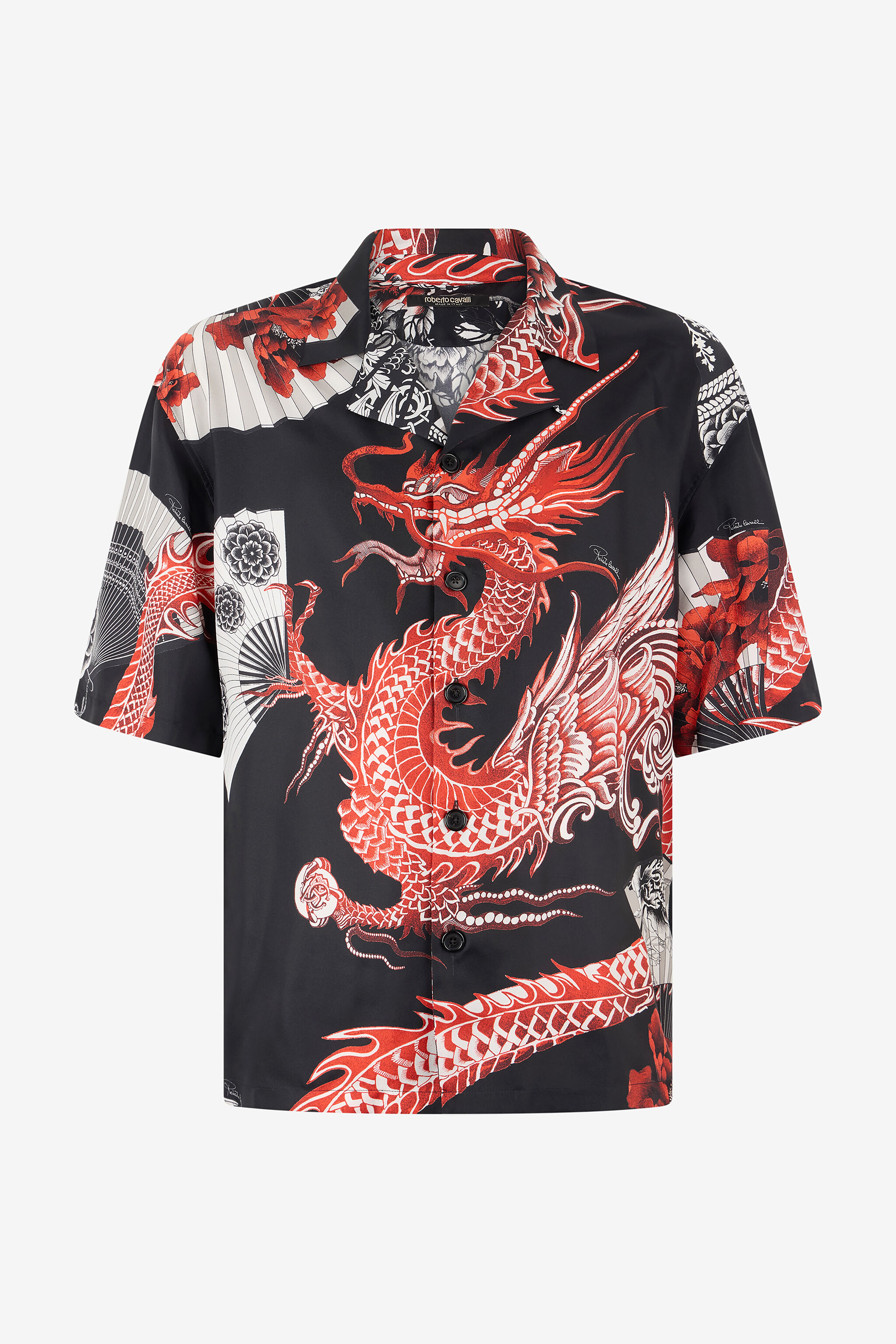 ID: VNT762-OZP75-T0968 Make an authentic style statement with this short-sleeved bowling shirt in pure silk by Roberto Cavalli, featuring a contrasting print with sinuous dragons, flowers and oriental-inspired fans that cover the entire surface of the garment. Details - Pure silk shirt - Pattern with dragons, flowers and fans - Small Roberto Cavalli signatures on the surface - Bowling collar - Short-sleeve design - Front button fastening - Roberto Cavalli label on the inside collar - Made in Italy