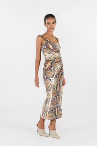 ID: UWT137-LNN93-J0256 This Python print midi dress embodies bold and sophisticated elegance. The fitted design highlights the silhouette, while the animal print adds a touch of wild luxury. The model is 178 cm tall and wears size S / 40. Details - Fitted design that enhances the figure - Distinctive Python print - Versatile and refined midi length - Made in: Italy - Ideal for special evenings or exclusive events, paired with high heels and minimalist accessories.