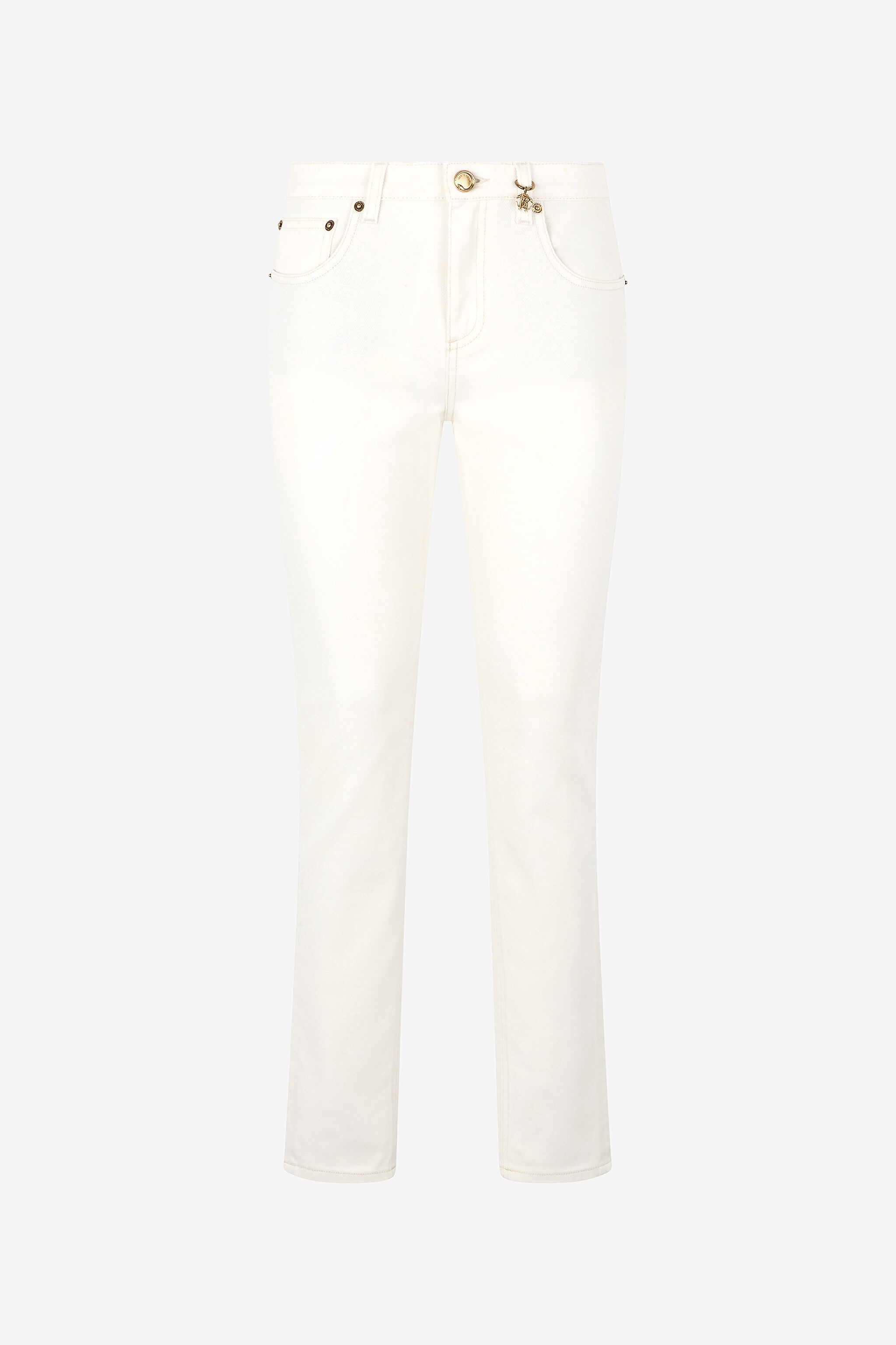 ID: UKJ232-KGN53-09088 The wild elegance of the reptilian world, which has always been a source of inspiration for Roberto Cavalli, is fully expressed in these women's five-pocket pants made from comfortable stretch cotton. The model features a delicate all-over solid-color python-effect print and is embellished by the iconic Mirror Snake Monogram, in an embroidered version on the back pocket and in the form of a golden charm on the belt loop. Details - Stretch cotton pants - Cotton lining - Five-pocket design - Straight leg - All-over python-effect print - Belt loops - Golden charm with Mirror Snake Monogram on a belt loop - Mirror Snake Monogram embroidered on the back pocket - Tag with lettering on back - Front branded button fastening Care & maintenance External fabric:98% Cotton, 2% Elastane / Lining:100% Cotton