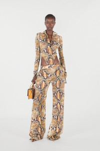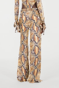 ID: UWT201-4QN93-J0256 Bold and sophisticated elegance merges in these Python print trousers. A distinctive garment that captures attention, perfect for those who love to dare with style. The wide and fluid fit guarantees comfort and freedom of movement, enhancing the silhouette. The model is 178 cm tall and wears size S / 40. Details - Wide leg design - High waist - Zip and hook closure - Made in: Italy - Ideal for an evening look or a special event - To be combined with a flowing shirt or a tight top Care & maintenance External fabric:100% Silk