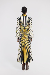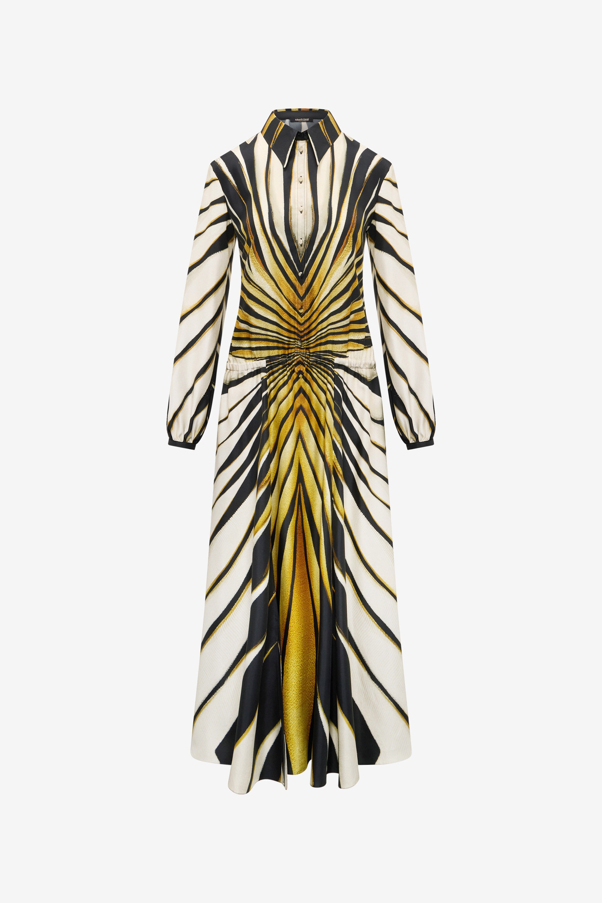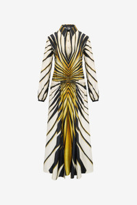 ID: TKT110-4QM33-01080 Capture the light with the Ray of Gold midi dress, a pure silk masterpiece radiating energy and refinement. The bold print, with its converging streaks of black, white, and gold, creates a hypnotic visual effect, accentuated by the gathered waist detail that sculpts the silhouette. Long sleeves and a classic collar add a touch of sophisticated elegance, making this piece perfect for those who wish to stand out with unmistakable style. The model is 178 cm / 5'10" tall and wears size S / 40 IT. Details - Midi dress featuring the Ray of Gold print - Crafted from fine silk for a luxurious feel against the skin - Design includes a classic collar and partial button placket - Long sleeves with cuffs - Gathered waist detail to define the figure - Flowing mid-calf length skirt - Perfect for daytime events or elegant evenings - Pair with high-heeled sandals and a mini bag for a complete look - Made in Italy Care & maintenance External fabric:100% Silk