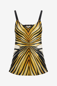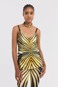 ID: TKT600-4QM33-01080 Radiate bold elegance with this silk top adorned with the Ray of Gold print. The design captures light and attention, featuring graphic patterns converging towards the V-neckline. Crafted from pure silk, it caresses the skin with luxurious fluidity, while the thin straps add a delicate touch. A piece embodying Roberto Cavalli's vibrant aesthetic, perfect for those who wish to stand out. The model is 178 cm / 5'10" tall and wears size S / 40 IT. Details - Camisole style top - Crafted from luxurious 100% pure silk - Features the graphic Ray of Gold print - V-neckline - Adjustable spaghetti straps - Perfect for evening looks or impactful daytime pairings - Pair with matching trousers for a bold total look - Made in Italy Care & maintenance External fabric:100% Silk