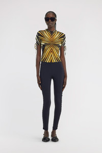 ID: TKT613-6HM33-01080 Illuminate your look with the Ray of Gold T-shirt, where hypnotic lines converge in a radiant display of golden hues and deep black. The fitted silhouette is enhanced by delicate ruffled edges at the high neck and hem, while drawstring details add a playful touch to the short sleeves. This piece embodies contemporary Cavalli allure. The model is 178 cm / 5'10" tall and wears size S / 40 IT. Details - Fitted T-shirt design - High neck with ruffle trim - Short sleeves with adjustable drawstrings and ruffle cuffs - Ruffled hemline - All-over Ray of Gold print - Ideal for statement daytime looks or evening ensembles - Pair with black trousers or a sleek skirt to let the print shine - Made in Italy Care & maintenance External fabric:95% Polyester, 5% Elastane