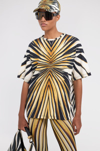 ID: TKT62D-3PM33-01080 Embrace the radiant energy of the Ray of Gold print with this striking Roberto Cavalli T-shirt. Crafted from comfortable cotton, the design features a mesmerising explosion of golden hues and contrasting tones, creating a bold visual statement. Its relaxed silhouette ensures effortless style, perfect for adding a touch of Cavalli's signature glamour to any look. The model is 178 cm / 5' 10" tall and wears size S / 40 IT. Details - Crew neck T-shirt - Crafted from comfortable cotton jersey - Features the distinctive Ray of Gold all-over print - Short sleeves - Relaxed fit for everyday comfort - Ideal for elevating casual ensembles - Pair with coordinating Ray of Gold items for a complete look - Made in Italy Care & maintenance External fabric:100% Cotton