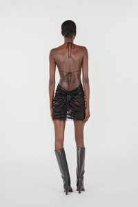 ID: UKR139-RT022-05051 This minidress by Roberto Cavalli is an ode to sensuality that is unafraid to dare. The emblematic Ray of Gold pattern in all-over sequins is interspersed with sheer fabric featuring floral inlays, while the bare-back design, deep neckline and criss-crossing laces on the front accentuate the contrast between the cuts and sheer detailing. Details - Fitted minidress - Halter neckline with criss-crossing laces on the front - Sequined Ray of Gold pattern - Sheer fabric with floral inlays - Backless - Lined model - Laces that tie on the back Care & maintenance External fabric:100% Polybutylene terephthalate / Secondary fabric:58% Polybutylene terephthalate, 42% Viscose / Rayon / Lining:100% Silk / Embroidery - Decoration:40% Polyvinyl chloride, 40% Glass fibre, 20% Polyester