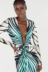 ID: VKT107-JRM33-04505 Immerse yourself in oceanic allure with the Ray of Sea maxi dress. The vibrant print, inspired by marine reflections, flows along the fluid silhouette, accentuated by a deep V-neckline and an elegant central knot that defines the waist. Long sleeves add a touch of sophisticated coverage, creating a perfect balance between boldness and refinement. A piece that captures the eye and embodies the free-spirited, luxurious essence of Roberto Cavalli. Details - Long-sleeved maxi dress - Crafted from a soft stretch viscose blend for comfort and fluidity - Deep V-neckline at the front - Draped knot detail at the front - All-over 'Ray of Sea' print - Perfect for evening events and special occasions - Pair with high-heeled sandals and a minimalist clutch - Made in Italy Care & maintenance External fabric:96% Viscose / Rayon, 4% Elastane
