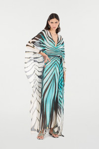 ID: VKW011-HNM33-04505 Embody the essence of coastal elegance with this kaftan, adorned with the vibrant Ray of Sea print. The fluid lines and wide sleeves evoke the sea breeze, while the V-neckline and waist tie accentuate the silhouette with sophisticated ease. A piece that catches the light and the eye, perfect for exclusive poolside moments or beach sunsets. Details - Long kaftan featuring the Ray of Sea print - Deep V-neckline - Wide, flowing batwing sleeves - Matching tie belt at the waist - Fluid and lightweight design - Ideal as a beach cover-up or for resort evenings - Pair with jewelled flat sandals and drop earrings - Made in Italy