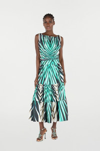 ID: VKT120-RLM33-04505 Immerse yourself in the vibrant energy of the Ray of Sea print with this captivating midi dress. Crafted from pure cotton, its flowing silhouette features a fitted bodice that cascades into a beautifully tiered skirt, creating graceful movement with every step. The abstract design, reminiscent of sunlit waves, makes a bold statement of sophisticated summer style. The model is 178 cm / 70 inches tall and wears size S / 40 IT. Details - Ray of Sea print midi dress - Crafted from breathable 100% Cotton - Sleeveless design with fitted bodice - Defined waistline - Flared, tiered skirt for added volume - Ideal for daytime events and elegant summer gatherings - Pair with heeled sandals for a complete look - Made in Italy Care & maintenance External fabric:100% Cotton