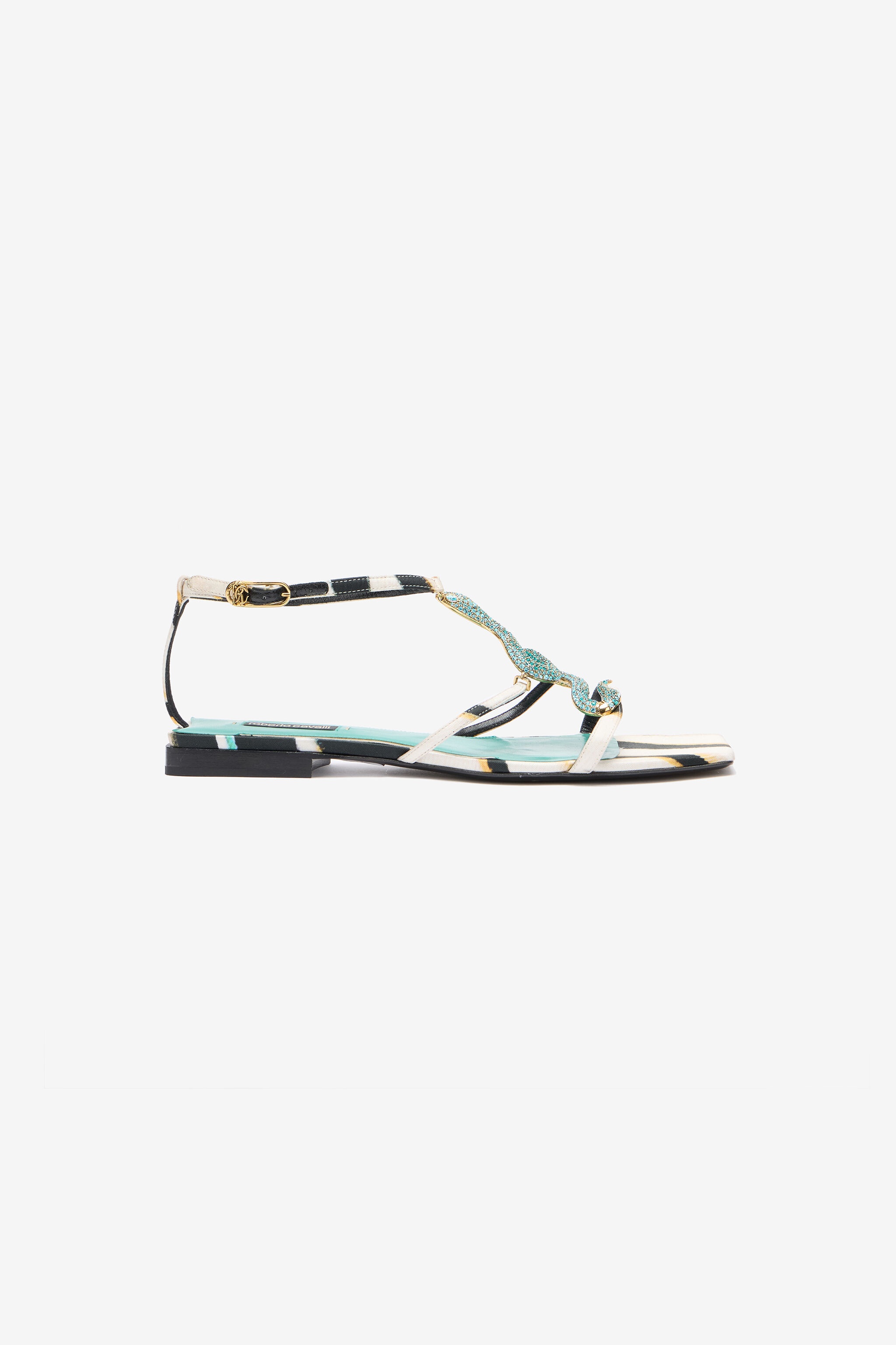 ID: VKS001-SE380-T0048 Capture the radiant essence of summer with the Ray of Sea flat sandals. The vibrant print evokes plays of light on water, while the sinuous, crystal-embellished snake adds an iconic, luxurious touch. A refined design that blends comfort and effortless elegance, perfect for brightening sunny days. Details - Flat T-bar sandal design - Ray of Sea print - Crystal-embellished snake motif applied to the T-bar strap - Adjustable ankle strap with buckle fastening - Square toe - Ideal for daytime elegance or resort evenings - Pair with flowing kaftans or tailored shorts for a complete look - Made in Italy