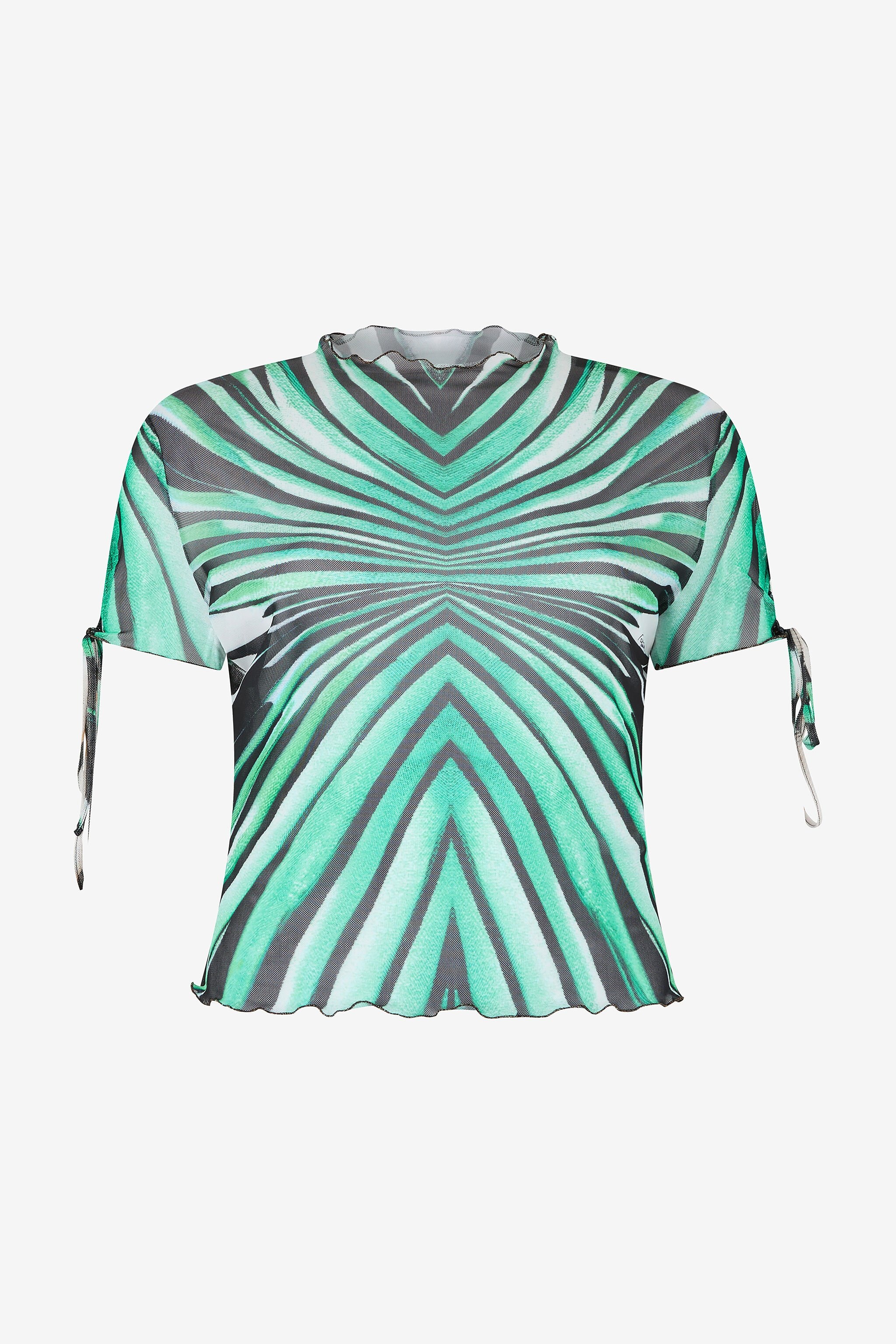 ID: VKT613-6HM33-04505 Immerse yourself in the hypnotic allure of the Ray of Sea print top. Crafted from lightweight mesh, this piece features a captivating design that captures the geometry of light filtering through water. Short sleeves with drawstrings add a versatile, adjustable touch, while the mock neck and lettuce hem define a modern, close-fitting silhouette. The model is 178cm / 5'10" tall and wears size S / 40 IT. Details - Short-sleeved mesh top - All-over Ray of Sea print - Mock neckline - Short sleeves with adjustable drawstring detail - Lettuce hem finish on cuffs and bottom hem - Slim fit - Perfect for bold daytime looks or special evenings - Pair with the coordinating trousers for a high-impact total look - Made in Italy Care & maintenance External fabric:95% Polyester, 5% Elastane