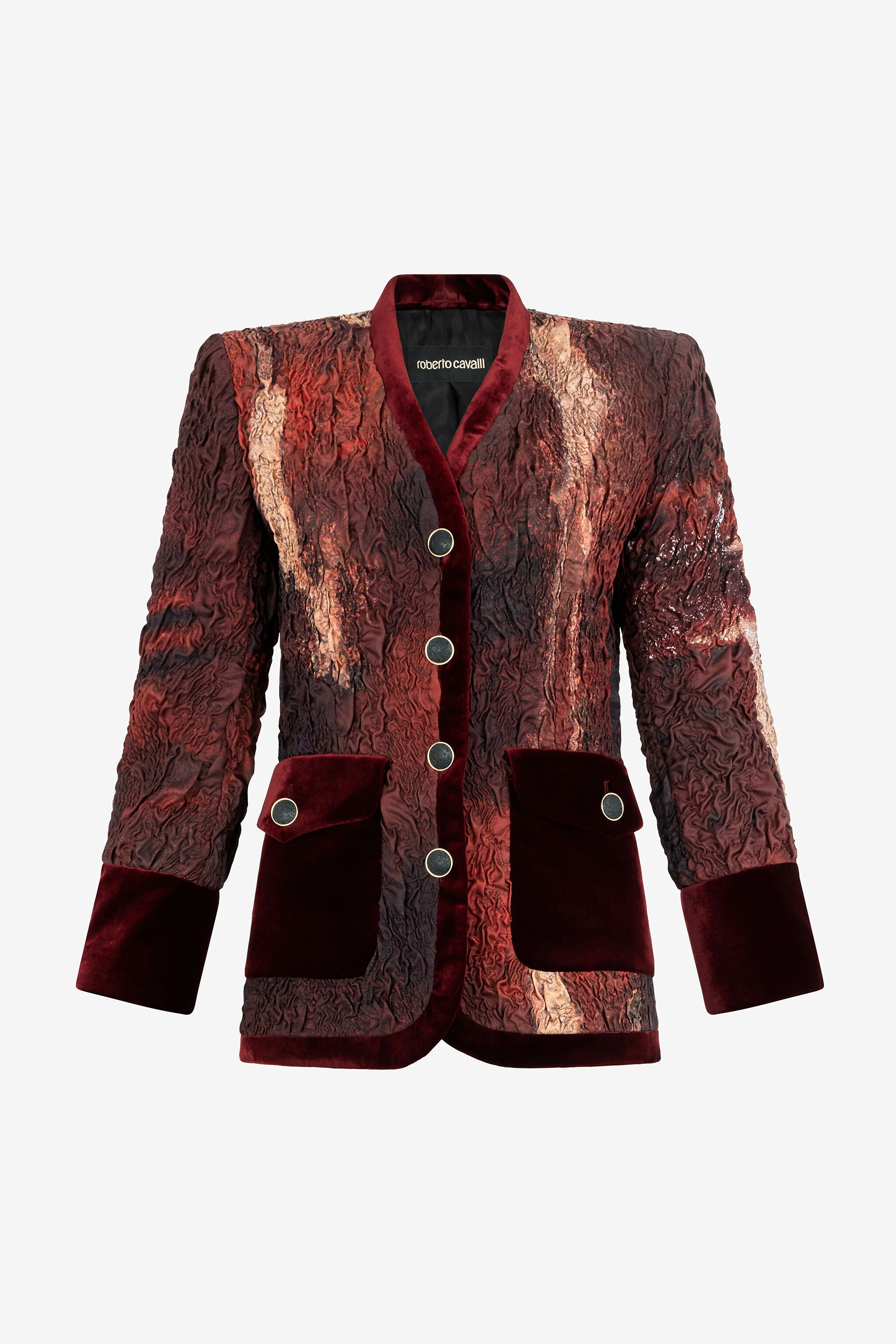 ID: VWR407-OZQ74-02006 An explosion of creative luxury, this jacket by Roberto Cavalli is made of pure silk with a crinkled effect and is decorated with a marble-effect print. The velvet trims, pockets and cuffs, together with engraved buttons and gold-tone trims, complete the garment with a sophisticated touch. Details - Crinkled-effect pure silk jacket - Marble print - Velvet trims, pockets and cuffs - Two pockets with button on the front - Front fastening with buttons Care & maintenance External fabric:100% Silk / Secondary fabric:82% Viscose / Rayon, 18% Silk / Lining:100% Viscose / Rayon