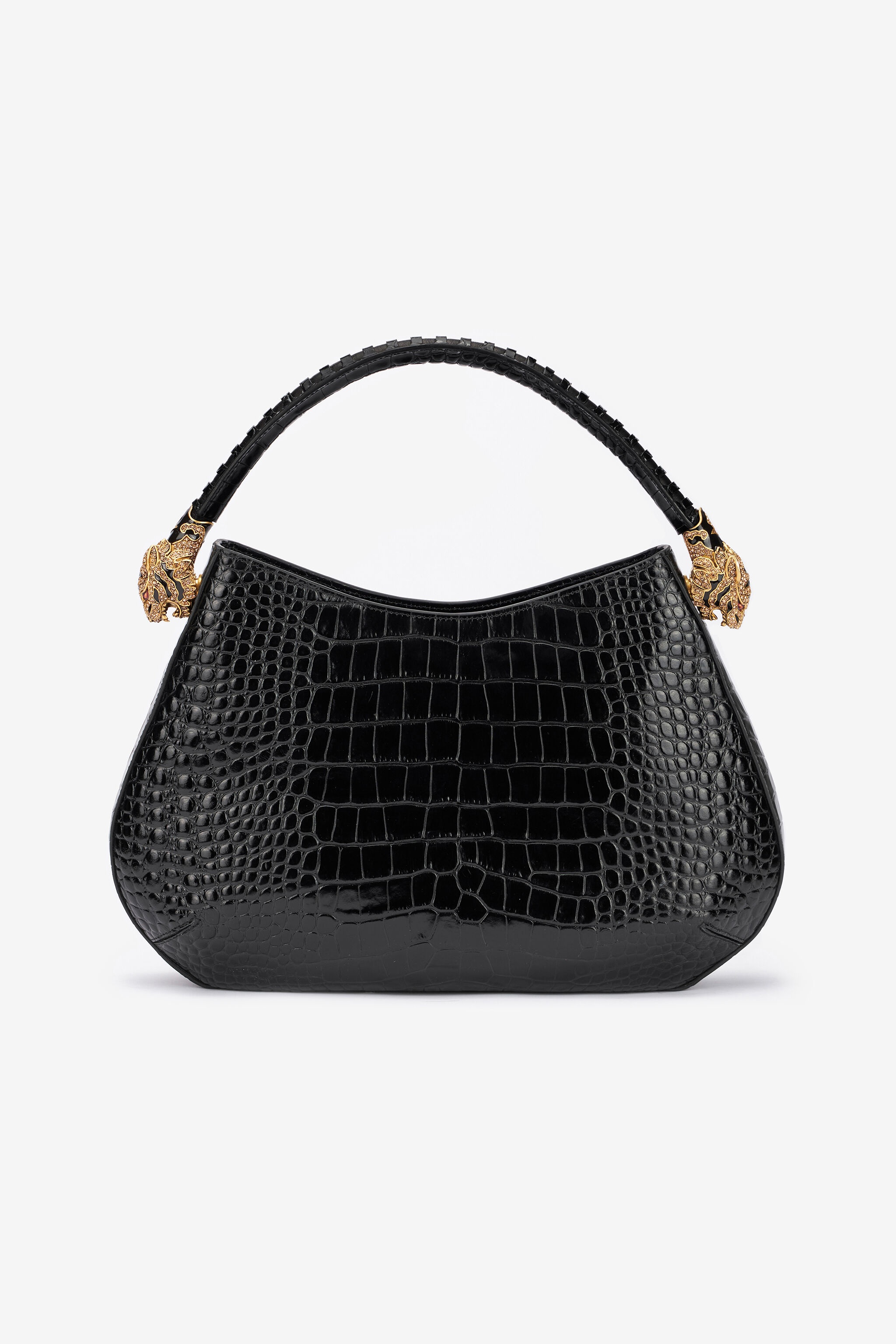 ID: TKB022-PZ975-05051 Elegant Roberto Cavalli shoulder bag in crocodile-embossed leather, featuring an iconic knot-shaped closure detail. The soft and compact design makes it perfect for a sophisticated day or evening look. Details - Measures 44x31x10 cm Care & maintenance Leather - Fur:Bos Taurus / Lining:97% Cotton, 3% Elastane