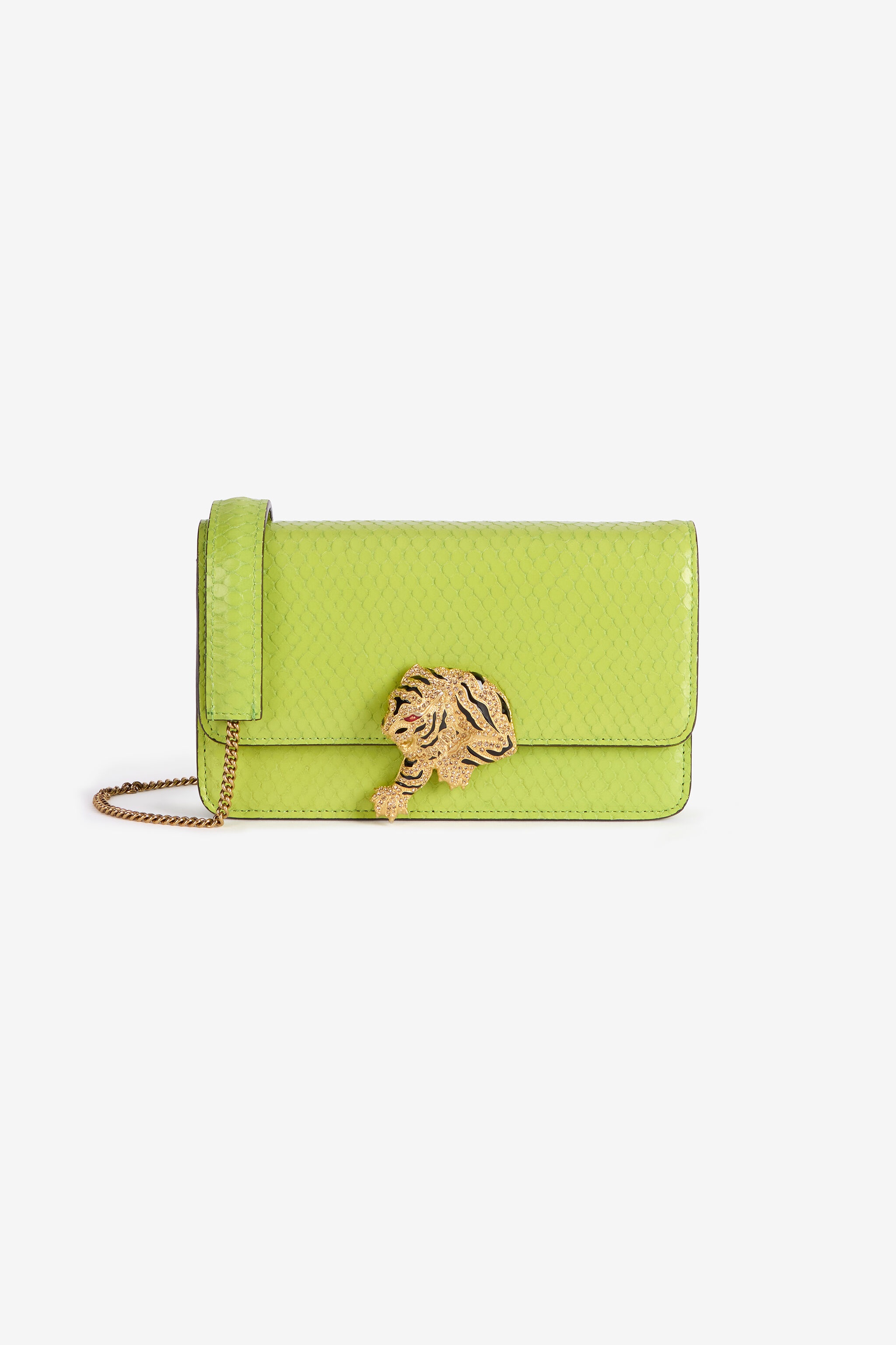 ID: TKB023-PZV98-D0113 This rectangular leather bag with a flat design is an ode to the distinctive style of the Roberto Cavalli universe, from the snake scale-effect print to the signature crystal-studded tiger that stands out on the flap. The slim chain shoulder strap can be removed with the clasps and is accompanied by a soft matching leather shoulder pad. It has been designed to offer two ways of carrying: over the shoulder or by hand. Details - Leather bag with snake scale-effect print - Flap with bejeweled tiger and magnetic fastening - Flat rectangular design - Chain strap that can be removed with the clasps and a matching leather shoulder pad - Can be carried over the shoulder or by hand - Lined interior Care & maintenance Leather - Fur:Bos Taurus / Lining:60% Polyester, 40% Polyurethane