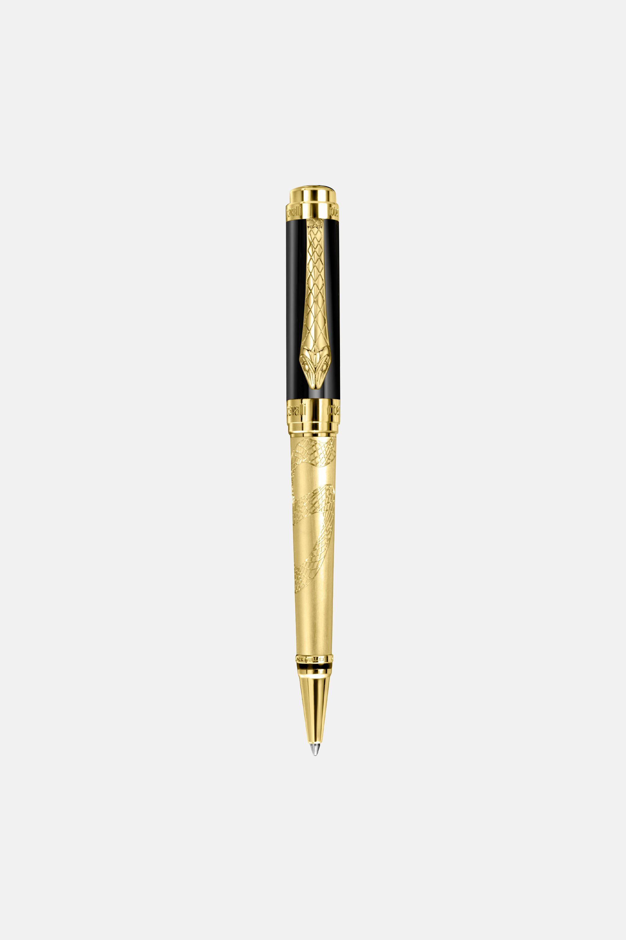 ID: VALG01-IG257-Z0544 Command attention with the Roberto Cavalli Serpentine Ballpoint Pen. The black lacquered upper barrel exudes sleek refinement, while the silver-tone lower barrel coils with the brand’s signature serpent, a symbol of power and transformation. The sculpted snake clip adds a daring accent, complemented by engraved logo details on the center band and cap top. Designed for a smooth, effortless writing experience, this pen pairs bold aesthetics with everyday functionality. Details - Roberto Cavalli Pen - Brass made with silver color plated metal - Upper barrel embellished with black lacquer - Snake motif wrapping around the lower barrel - Iconic snake design on the clip - Engraved logo detail on the middle ring and on the cap top - Writing instrument with black inkSize: 13 X 142mm - Dressed in an elegant branded sleeve Care & maintenance Composition:Brass