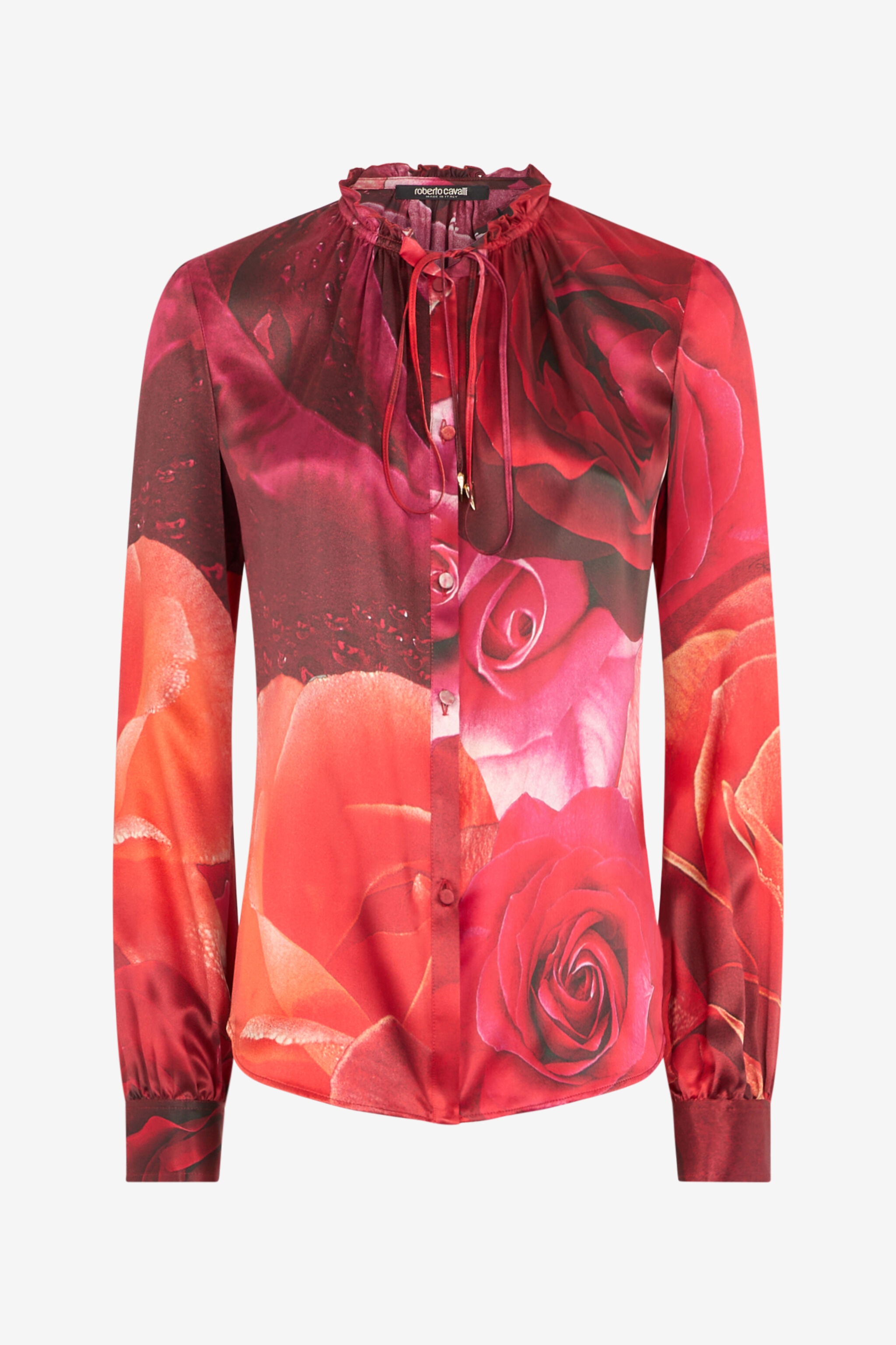 ID: UKT702-RYN48-02000 This elegant pure silk shirt by Roberto Cavalli is entirely made in Italy and features a mandarin collar finished with ruffles and a lace to be tied at the neck with metallic aglets in the shape of a tiger Fang. But the real star of the garment is the all-over maxi rose print, which will add a touch of romantic opulence to any look. Details - Pure silk shirt - All-over maxi-rose print - Ruche-finished Mandarin collar - Tie lace on the neck with metal Fang aglets - Long sleeves - Front button fastening - Roberto Cavalli label on the inside collar - Made in Italy Care & maintenance External fabric:100% Silk