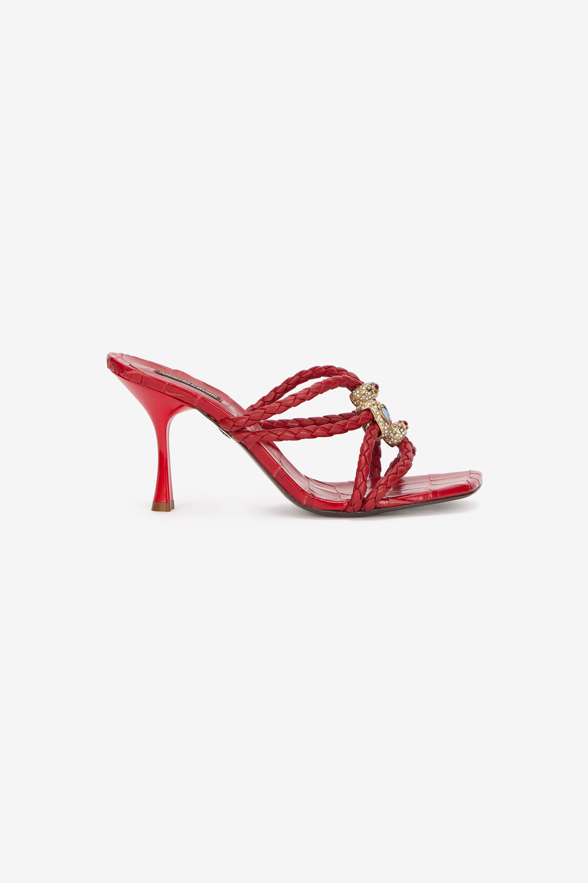 ID: VKS014-PZ579-02066 These elegant heeled sandals by Roberto Cavalli feature braided straps that converge at the front, secured by lavish gold-tone embellishments set with crystals, two with a central round gem and two with a central teardrop-shaped gem. The design is complemented by an insole with crocodile scale-effect embossing. Details - Sandals with heels - Square toe design - Braided straps - Jewel details studded with crystals with round gemstone and drop-shaped gemstone - Insole with crocodile scale-effect embossing - Roberto Cavalli label on the insoles - Metallic RC monogram under the sole - Made in Italy