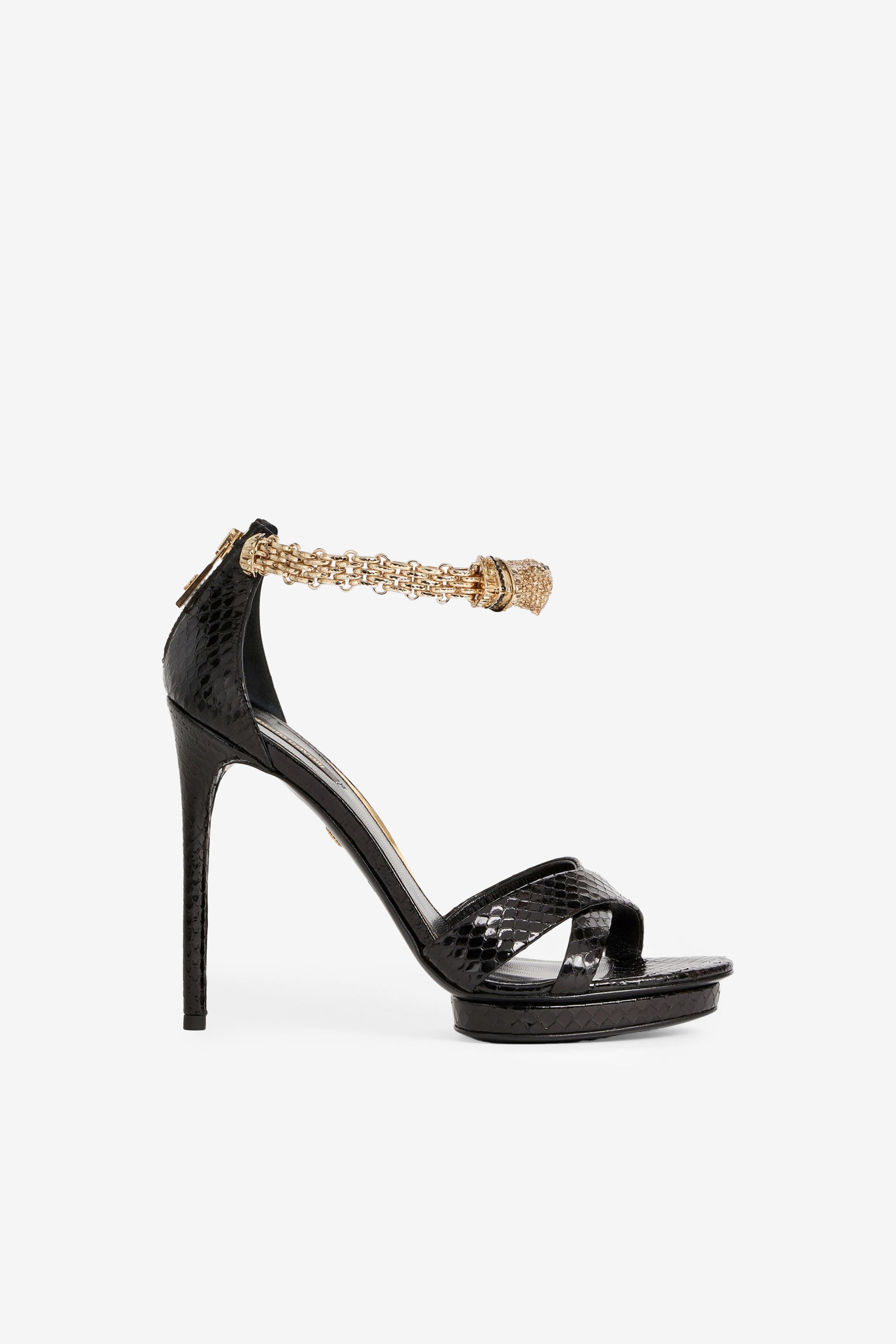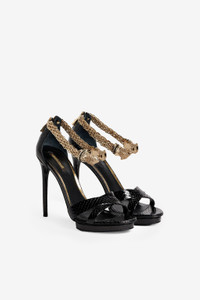 ID: FWS199-PA001-05051 This season, Swarovski crystals enhance the sensuality and femininity core to Roberto Cavalli’s footwear collection. The black python platform sandals are high-octane glamour at its best, and feature an intricately embellished panther and chain ankle strap. Details - Crystal-Embellished Panther Sandals - 120mm heel - Black and dark yellow Swarovski crystals - High stiletto heel - Back zip closure - Domestic shipping only - Made in Italy Care & maintenance Leather - Fur:Homalopsis Buccata / Lining:100% Capra hircus linneaus