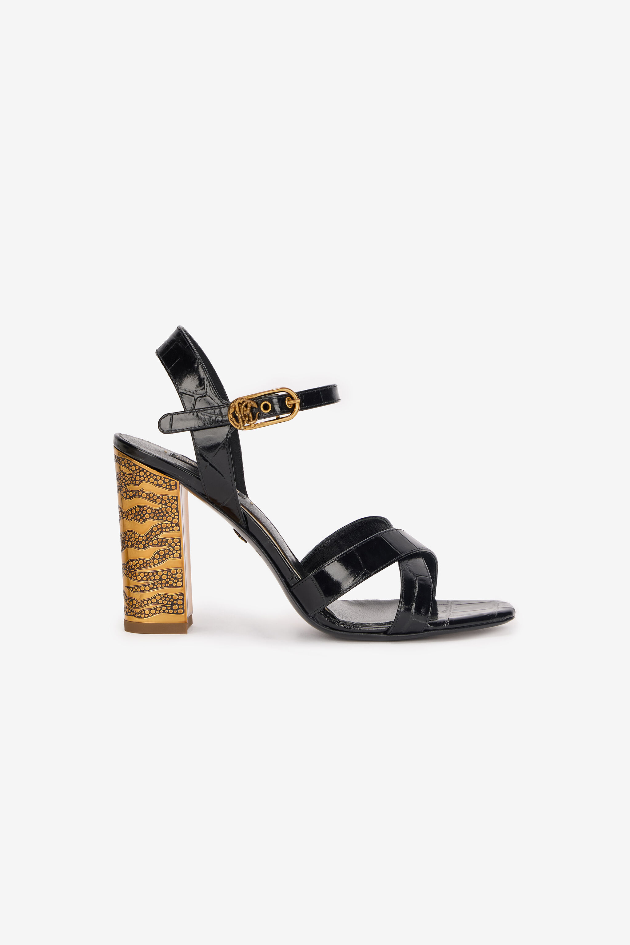 ID: VKS026-PZ579-05051 Elegance, boldness and originality are the keywords for these Roberto Cavalli sandals featuring iconic crocodile scale-effect embossing and a thick golden heel with an animal-inspired motif. The style features two crossed bands on the front and an adjustable ankle strap with a buckle defined by the iconic Mirror Snake Monogram, a further tribute to the reptile universe that has always fascinated the Maison. Details - Sandals with crocodile scale-effect embossing - Two crossed bands on the front - Ankle strap with buckle with Mirror Snake Monogram - Thick golden heel with animal-inspired motif - Roberto Cavalli label on the insoles - Metallic RC monogram under the sole - Made in Italy