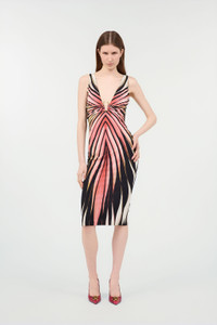 ID: VKT100-LNM33-02500 A warm and hypnotic Ray of Pink print spreads across this dress by Roberto Cavalli, ready to add a touch of luxury to any look. The garment, with its seductive sheath design, features a deep V-neckline that ends with a golden detail with the tiger Fang, a meeting point of two bands that converge on the front creating an elegant gathered effect. Details - Sheath dress - All-over Ray of Pink print - Sleeveless design - Plunging V-neck - Golden detail on the front with Fangs - Zipper fastening on back - Roberto Cavalli The Webster label on the interior Care & maintenance External fabric:86% Polybutylene terephthalate, 14% Elastane