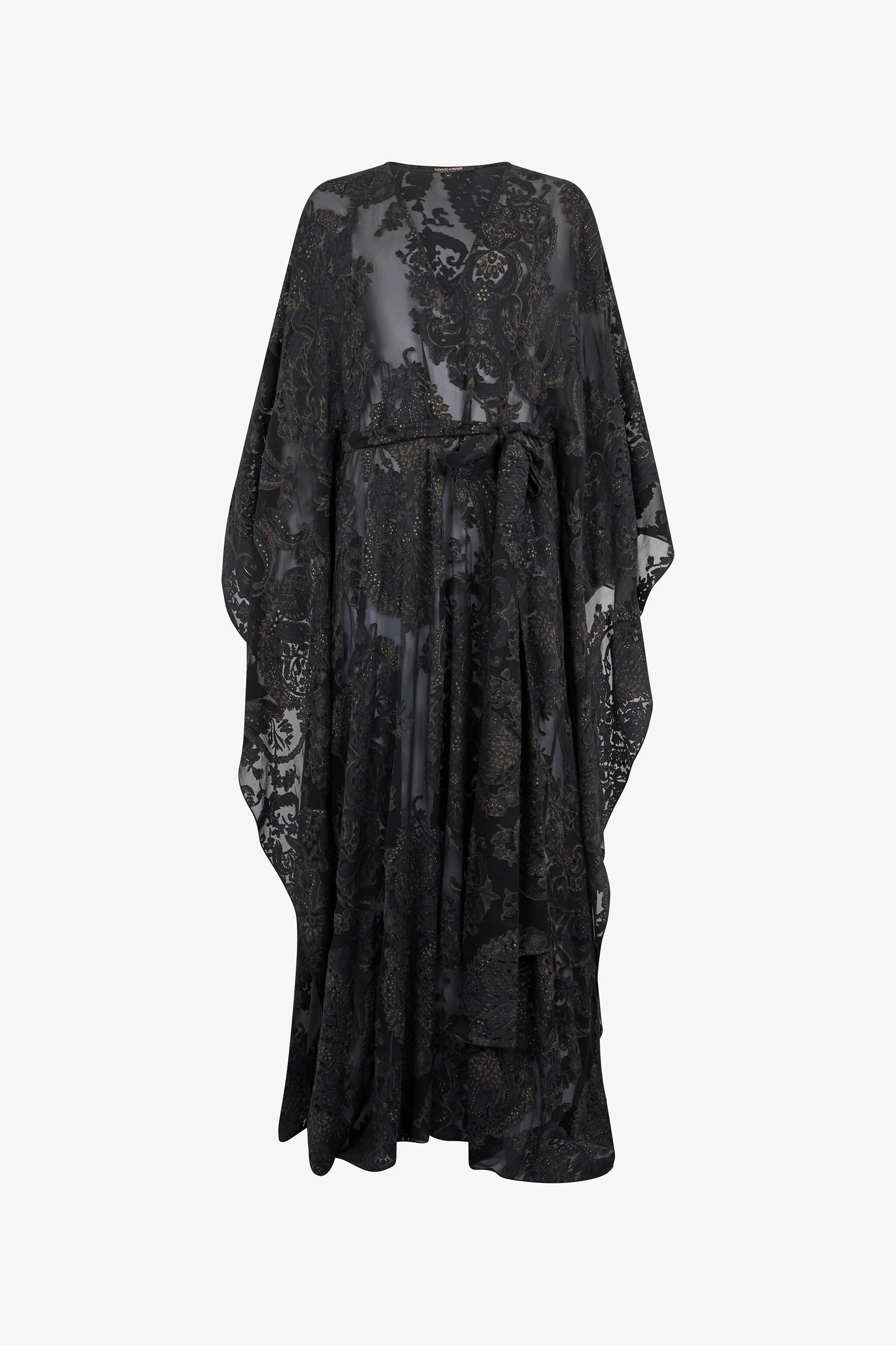 ID: WKW011-SLR36-05051 A captivating kaftan with a beautifully fluid silhouette. The seductively sheer see-through fabric drapes the body in a luxurious embrace, while refined detailing adds a touch of sophisticated artisanal craftsmanship. A piece that tells a story of timeless elegance and allure. Details - Ornamental Black motif - Fluid, enveloping silhouette - Seductive sheer fabric - Refined, artisanal details - Captivating, seductive elegance