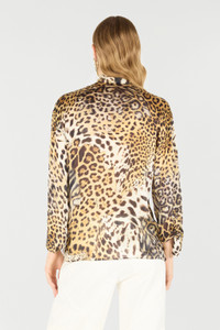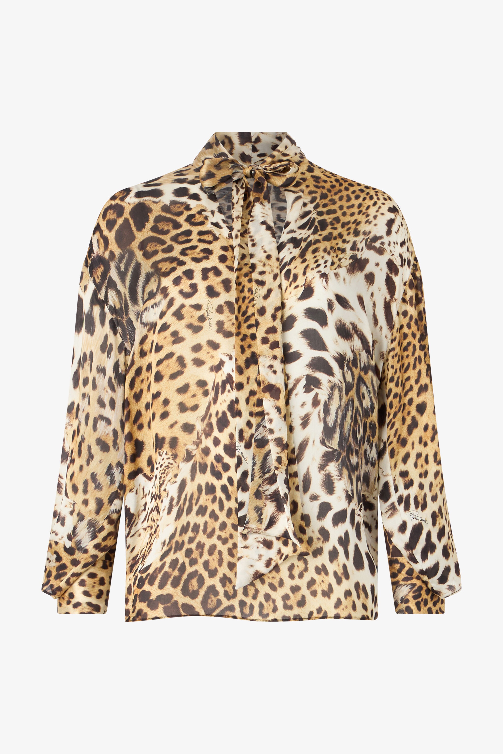 ID: UKT712-CTG34-00504 A roaring Jaguar Skin print decorates this pure silk shirt by Roberto Cavalli, where the animalier wild elegance is combined with fluid details, such as the grandad collar with sash to tie at the front and the long sleeves with frill. Details - Pure silk shirt - All-over Jaguar Skin print - Small Roberto Cavalli signatures - Ruffled long sleeves - Band collar with cut-out and tie sash belt Care & maintenance External fabric:100% Silk