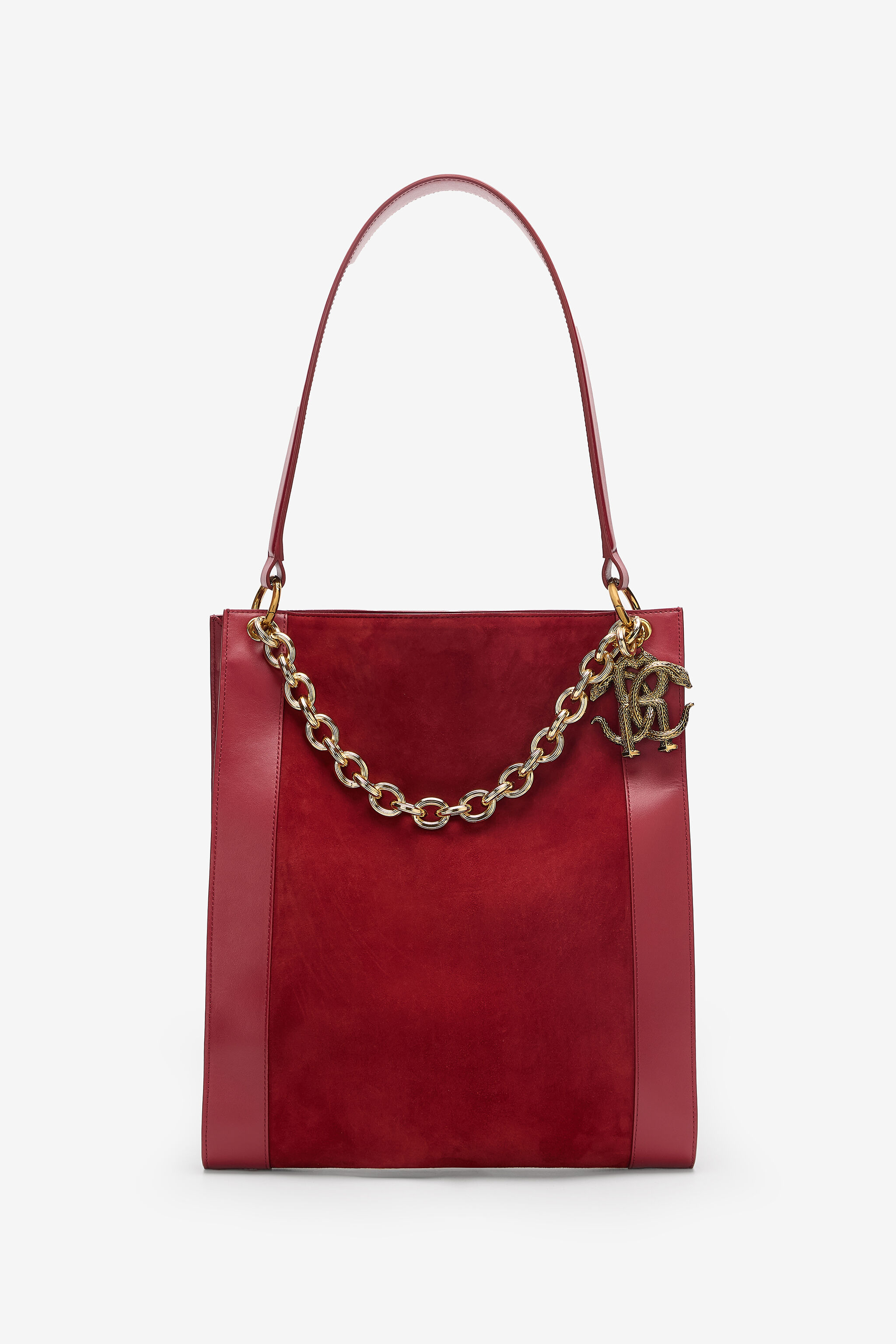 ID: VKB005-PC219-02066 The perfect combination of elegance and functionality, this shoulder bag by Roberto Cavalli will bring a touch of luxury to your everyday looks. The style, characterized by a spacious silhouette that extends vertically, plays on the contrast of textures created by the smooth side panels and the central panels with a suede effect. The accessory is complete with a convenient top handle and is enriched by a chain with thick links, embellished with a charm with the iconic Mirror Snake Monogram, which lends itself both to falling on the front in the form of a decorative element, and to being used as a second handle. Details - Large shoulder bag - Spacious design - Vertical rectangular design - Smooth-textured side panels - Central panel with suede texture - Top handle - Decorative chain to be used as a handle - Charm with Mirror Snake Monogram - Top opening - Contrasting animal print lining