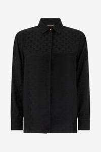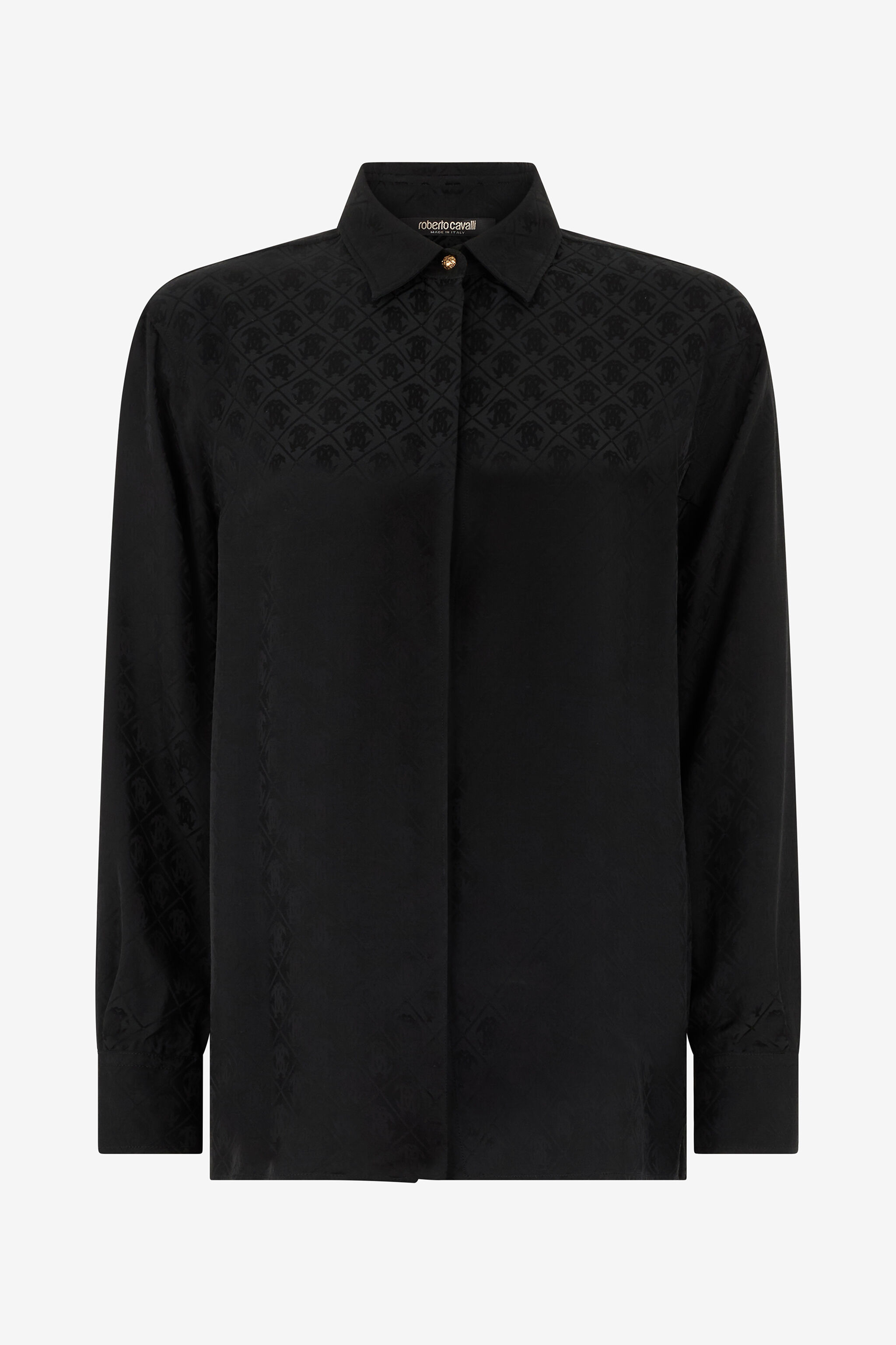 ID: VKT704-RK010-05051 A testament to understated elegance, this shirt is crafted from a fluid silk-viscose blend. A tonal jacquard featuring the iconic Monogram RC adds a layer of subtle sophistication, creating a piece that is both timeless and distinctly Cavalli. The classic silhouette is punctuated by a single gold-tone button at the collar, a refined touch that completes this versatile wardrobe essential. The model is 178 cm tall and wears size S / 40 IT. Details - Classic collar shirt - Crafted from a luxurious silk and viscose blend for a fluid feel and subtle lustre - Features an all-over tonal jacquard with the Monogram RC - Concealed front buttoning and a single exposed gold-tone button at the collar - Long sleeves with buttoned cuffs - Perfect for transitioning from office looks to elegant evening occasions - Pair with the matching trousers for a sophisticated total look - Made in Italy