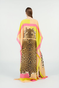 ID: WQT180-SQR33-01000 Let yourself be wrapped in the allure of this silk kaftan, where a leopard print blends harmoniously with vibrant colors, creating a luxurious visual experience. A piece that enhances fluidity and grace, perfect for those who love to stand out with both elegance and boldness. Details - Leopard print on refined silk - Fluid, enveloping silhouette - Vibrant chromatic details - Sophisticated, bold design