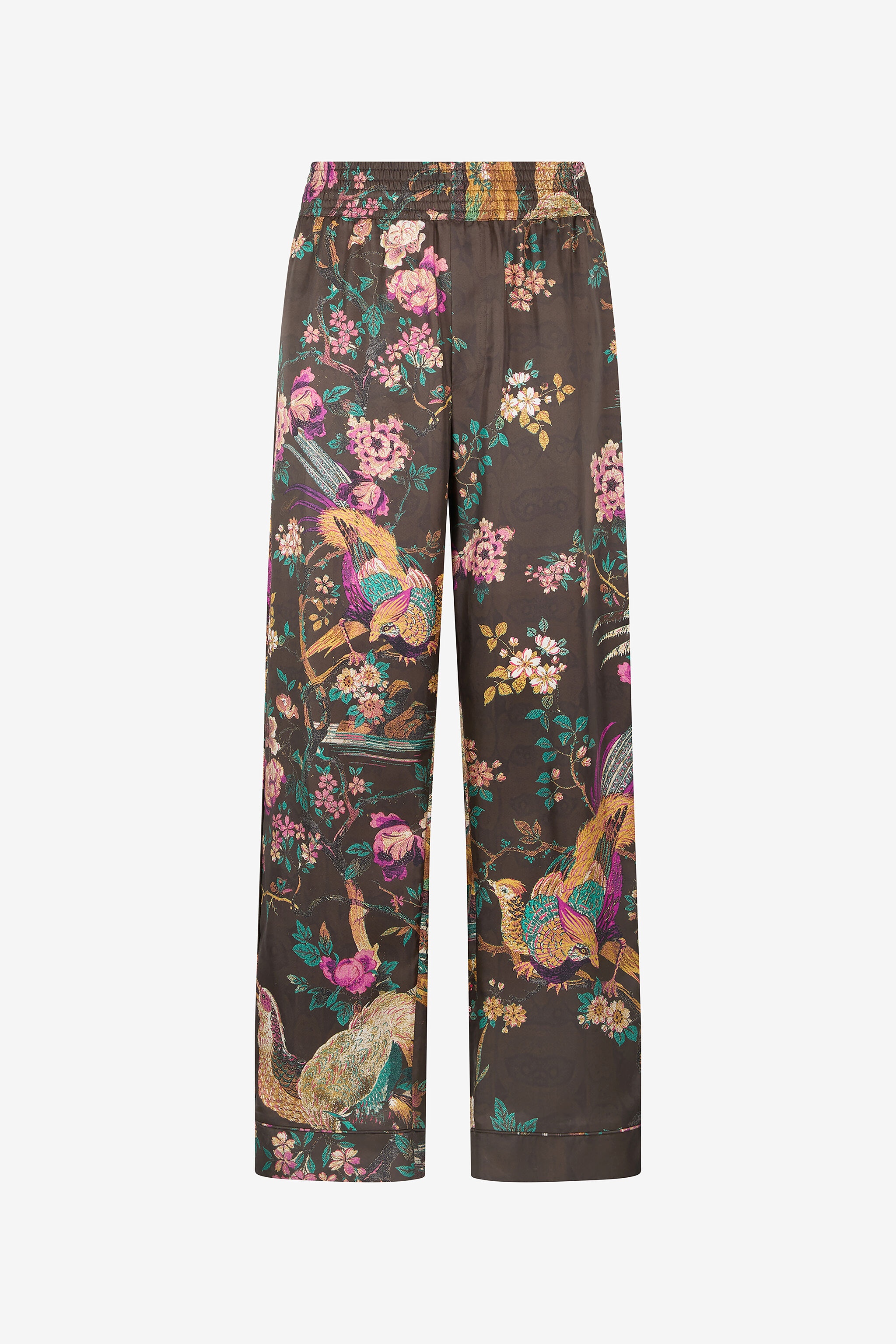 ID: VRT266-OZP76-ZO047 The refined and colorful print depicting a natural landscape with flowering branches and pheasants is the total star of these pants made of pure silk, characterized by a wide and loose leg and a comfortable waist with elasticated insert. Adding a touch of practicality are the convenient side pockets and a patch pocket on the back. Details - Pure silk pants - Loose fit with long, relaxed leg - Pattern with pheasants, flowering branches and all-over natural landscape - Monochrome Python pattern in the background - Elasticated insert on the waist - Side pockets - Patch pocket on the back - Tone-on-tone topstitching along the hem
