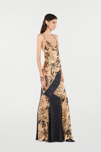ID: VKT127-FC008-D0394 This long slip dress-inspired gown stands out for its soft lines and a romantic all-over rose pattern, accented by an elegant silk band that climbs up from the hem and wraps around the hips. The see-through effect, the thin crossed straps at the back and the refined cascading neckline further enrich the garment with a touch of sensuality and opulent elegance. Details - Silk-blend slip dress - All-over rose motif - Fitted cut with flared hem - Slim crossover straps at the back - Backless - Cascading neckline