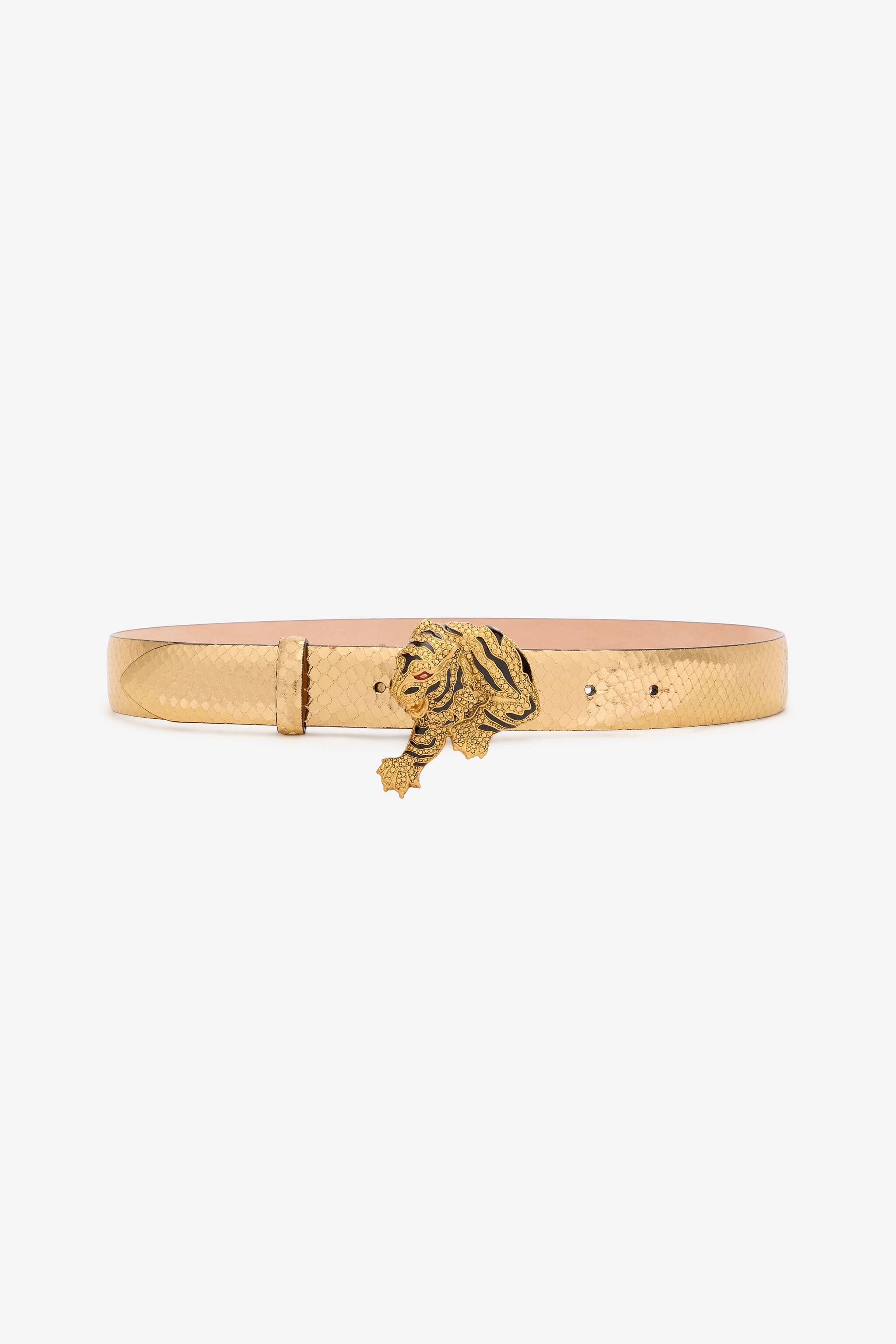 ID: TKC002-PZ579-00047 This belt in rich laminated leather with an all-over snake scale effect features a precious tiger buckle studded with crystals, for a roaring touch in pure Roberto Cavalli style. Details - Snake scale-effect laminated leather belt - Bejeweled tiger on the buckle - Single loop - Contrasting leather-lined interior with Roberto Cavalli logo Care & maintenance Leather - Fur:Aegagrus Hircus / Lining:100% Bos Taurus