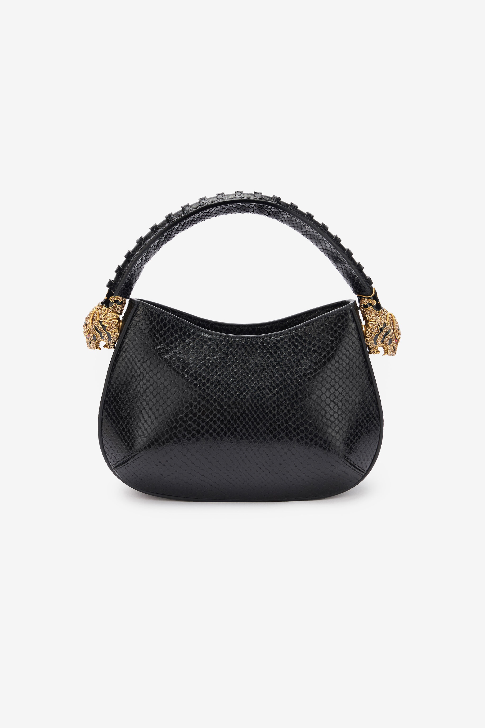 ID: TWB002-PZV98-D0007 This hobo bag is crafted from genuine leather with a snake scale-effect print and celebrates the DNA of the Roberto Cavalli Maison thanks to the logo on the front and two crystal-studded tiger heads decorating the ends of the top handle. The accessory, which has a convenient top opening, can be worn by hand or over the shoulder. Details - Snake scale-effect leather hobo bag - Top handle with bejeweled tiger heads on tips - Roberto Cavalli logo on the front - Top opening - Lined interior - Made in Italy Care & maintenance Leather - Fur:Bos Taurus / Lining:97% Cotton, 3% Elastane