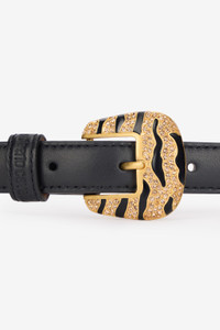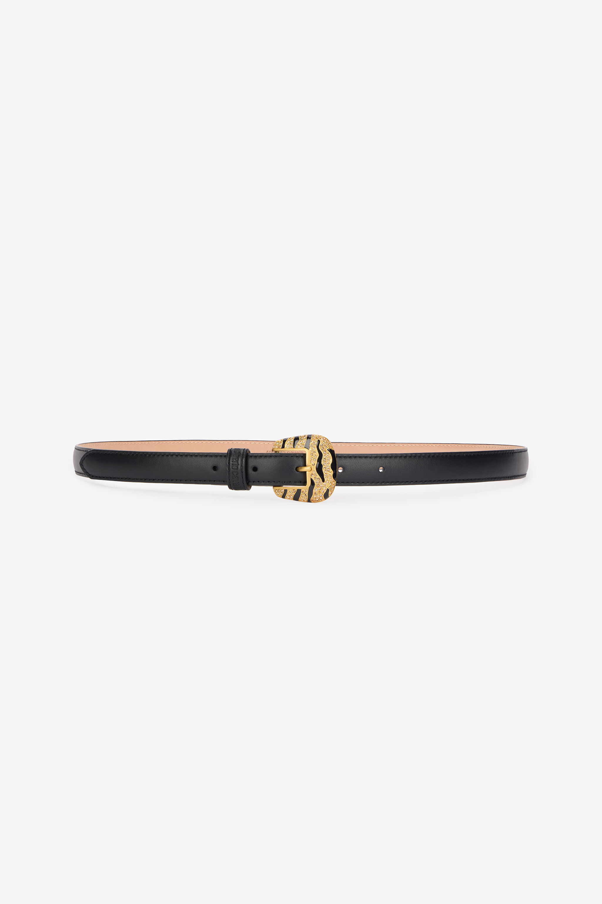 ID: VKC006-PZ796-05051 Available in a slim design and a solid-color version to ensure versatility, this belt by Roberto Cavalli is defined by a precious buckle studded with crystals and decorated with the Tiger Skin pattern, an authentic tribute to the brand's fascination with the animal universe. Details - Solid-color slim belt - Bejeweled buckle with Tiger Skin pattern - Roberto Cavalli logo on the belt loop - Contrasting interior with Roberto Cavalli logo