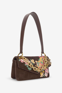 ID: VKB018-PC010-01660 A refined embroidery with flowering branches and pheasant is the undisputed protagonist of this rectangular bag by Roberto Cavalli, featuring a refined suede texture and a construction with side panels that creates two internal compartments. The accessory is complete with a convenient top handle and is enriched by a chain with thick links, embellished with a charm with the iconic Mirror Snake Monogram, which lends itself both to falling on the front in the form of a decorative element, and to being used as a second handle. Details - Suede shoulder bag - Embroidery with flowering branches and pheasant on the front - Rectangular design with gusseted side panels - Top handle - Decorative chain to be used as a handle - Charm with Mirror Snake Monogram - Two internal compartments - Inner lining with Cheetah Skin print