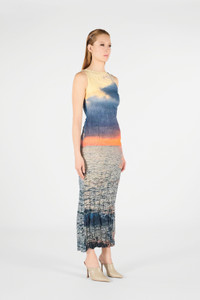 ID: UWT109-4QN96-05144 The long dress with Sunrise print captures the essence of a serene dawn, transforming a moment of stillness into a haute couture garment. The fitted fit enhances the silhouette, while the print evokes a sense of magic. The model is 178 cm tall and wears size S / 40. Details - Figure-hugging design that enhances the silhouette - Exclusive Sunrise print - Sleeveless for a sophisticated look - Made in: Italy - Ideal for evening events and special occasions - Perfect paired with high heels and minimalist accessories Care & maintenance External fabric:100% Silk / Secondary fabric:100% Silk