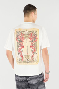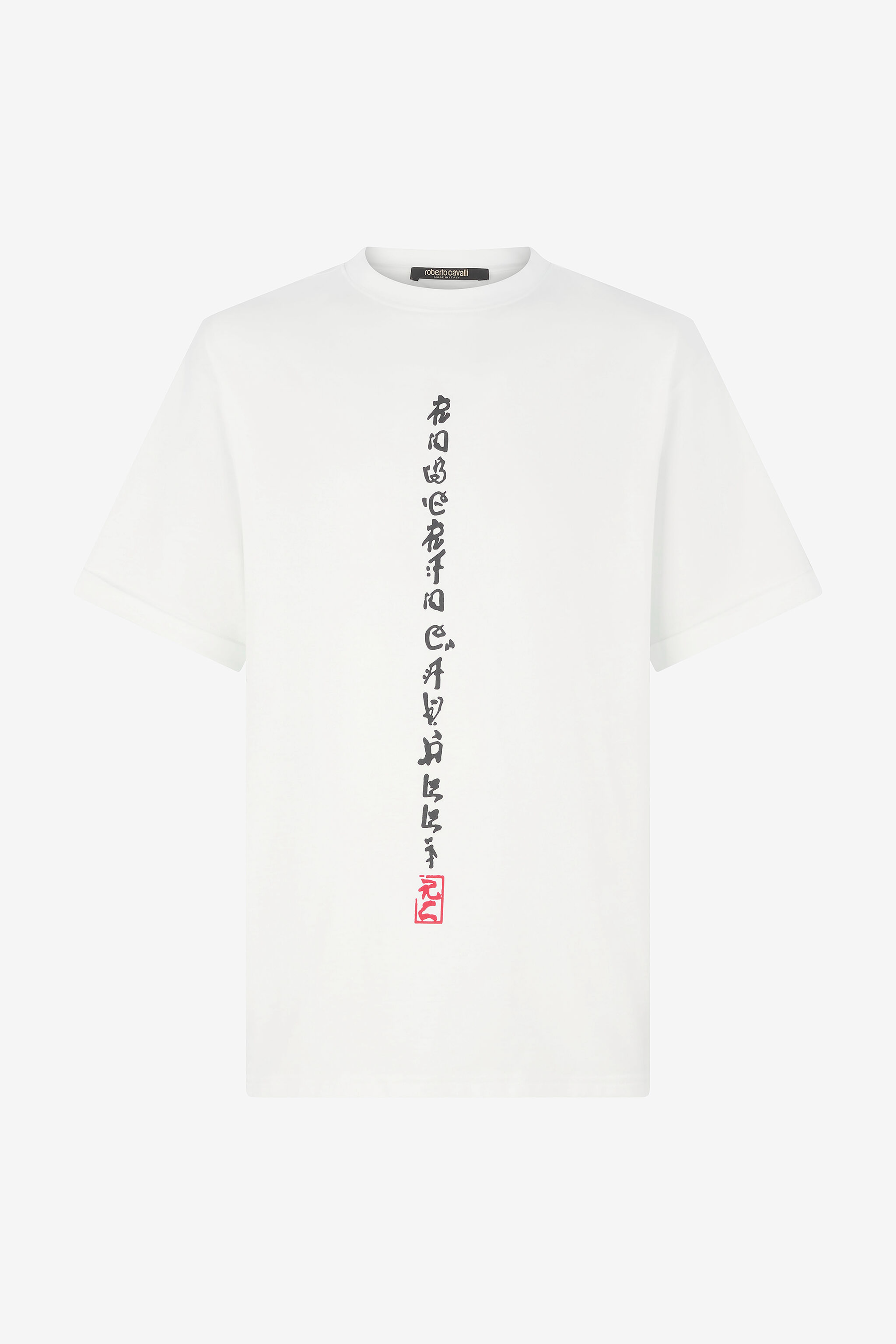 ID: VNT62I-JD060-00052 An emblem of contemporary luxury, this pure cotton T-shirt by Roberto Cavalli will instantly elevate your everyday looks. The piece features a large print on the back inspired by Eastern antiquity, depicting two Chinese dragons and the Roberto Cavalli logo with an RC monogram in ideogram style, which is also echoed on the front. Details - Pure cotton T-shirt - Crew-neck - Short sleeves - Roberto Cavalli logo and RC monogram in the style of ideograms on the front and back - Ancient oriental-style print with dragons on the back - Roberto Cavalli label on the inside collar - Made in Italy