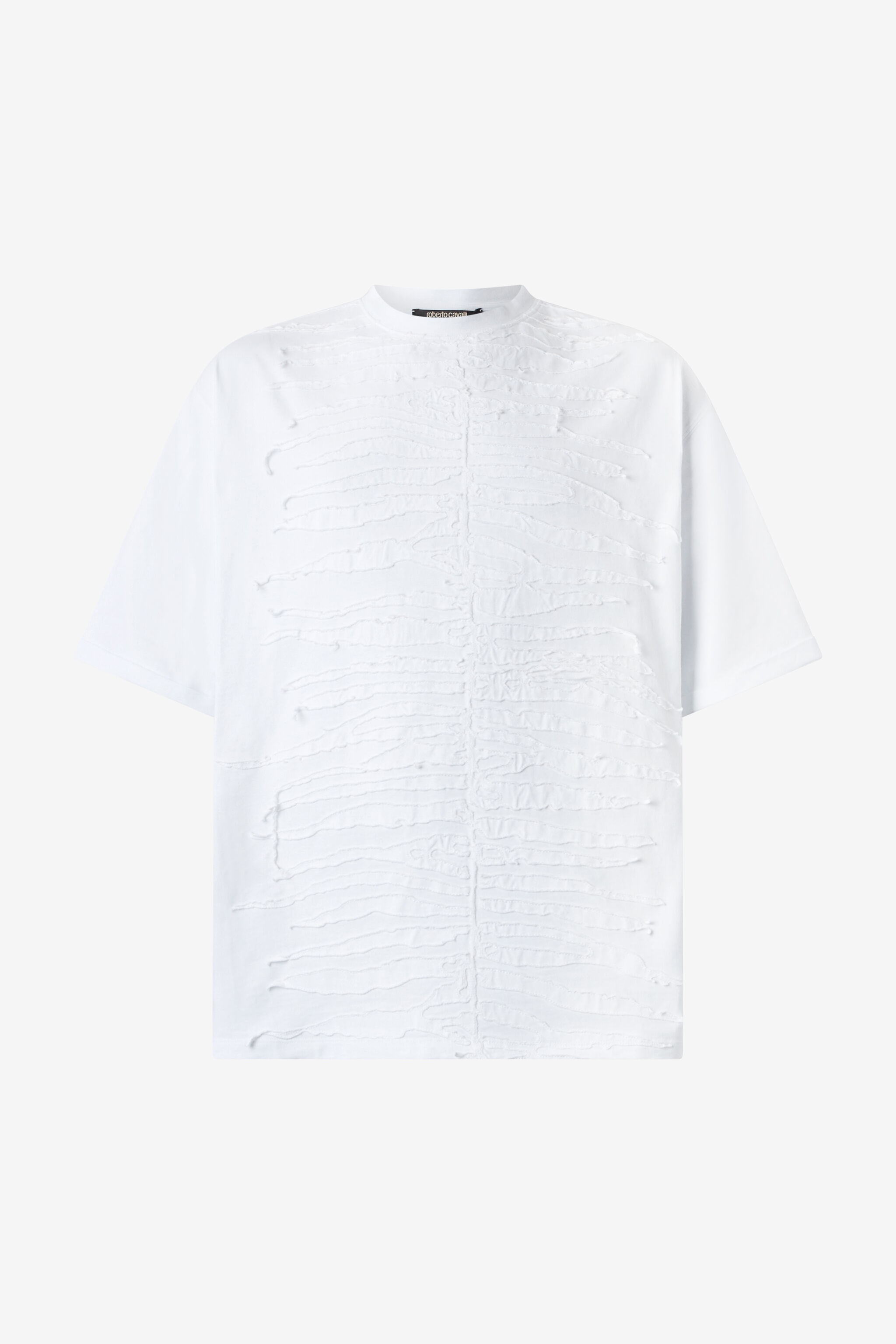 ID: URT62N-JD060-00052 This pure cotton T-shirt by Roberto Cavalli with a minimalist cut is decorated by an original texture with a Zebra motif, ready to give a touch of wild sophistication even to the most casual outfits. Details - Pure cotton T-shirt - Zebra pattern texture - Crew neck - Half sleeves with dropped shoulders - Roberto Cavalli label on the inside collar Care & maintenance External fabric:100% Cotton