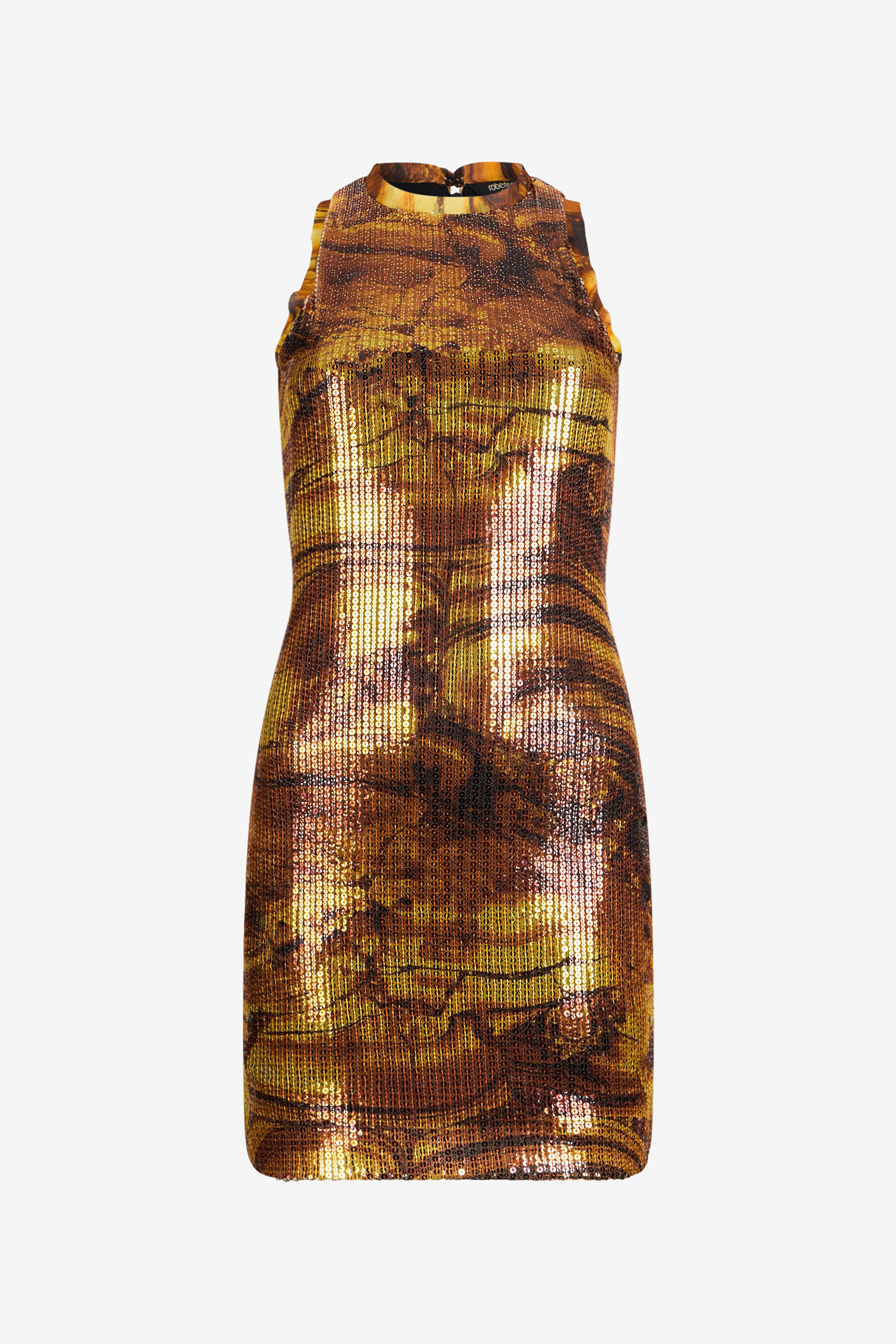 ID: VKT170-VXP74-D4162 This dress captures the hypnotic allure of the Tiger Eye gemstone, translated into a mesmerizing print that swirls across a canvas of dazzling sequins. The high-neck, body-hugging silhouette is designed to sculpt and flatter, creating a look of powerful and sophisticated glamour. Each movement catches the light, ensuring an unforgettable entrance. The model is 178 cm tall and wears size S / 40 IT. Details - High-neck sleeveless mini dress - Tiger Eye print - Allover sequin embroidery - Body-hugging fit - Concealed back zip closure - Ideal for exclusive parties, cocktails, and special evenings - Pair it with stiletto heels and a minimalist clutch for a stunning look - Made in Italy