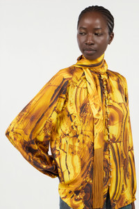ID: VKT700-4QP74-D4162 Unleash your inner strength with this captivating shirt, adorned with the hypnotic Tigereye print. The design emulates the rich, layered beauty of the gemstone, creating a visual narrative of power and elegance. Crafted from a fluid fabric, it drapes beautifully over the form, while dynamic fringe details and a sophisticated tie-neck add a touch of untamed Roberto Cavalli glamour. This piece is not just a garment, but a statement of bold confidence. The model is 178cm / 5'10" tall and wears a size S / 40 IT. Details - Fluid silhouette shirt with an all-over print. - Crafted from pure silk, offering a luxurious and lightweight feel against the skin. - Features a sophisticated high neck with a self-tie lavalliere. - Elegant fringe inserts applied to the front. - Detailed with a concealed button closure and an adjustable drawstring at the hem. - Long balloon sleeves with elasticated cuffs. - Perfect for an exclusive event or to elevate a daytime look. - Pair it with tailored black trousers to let the print take centre stage. - Made in Italy.