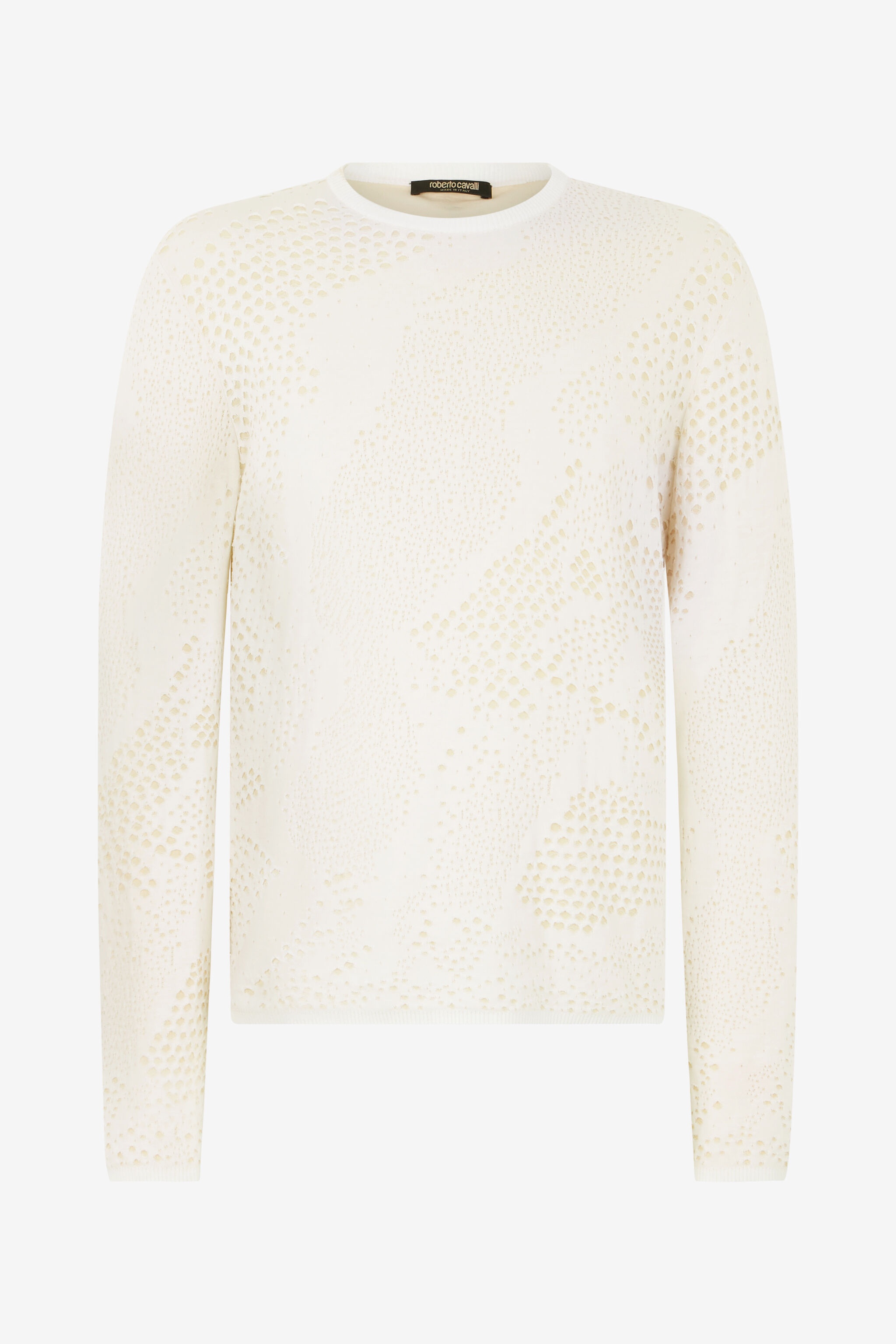 ID: URM610-MG008-00052 The touch of wild elegance that has always set the Roberto Cavalli universe apart is reinterpreted in this pure cotton top through a refined python motif that extends across the entire surface of the garment. Details - Pure cotton top - All-over Python pattern - Crew neck - Long sleeves - Rib-knit neck, cuffs and hem - Roberto Cavalli label on the inside collar - Made in Italy Care & maintenance External fabric:100% Cotton