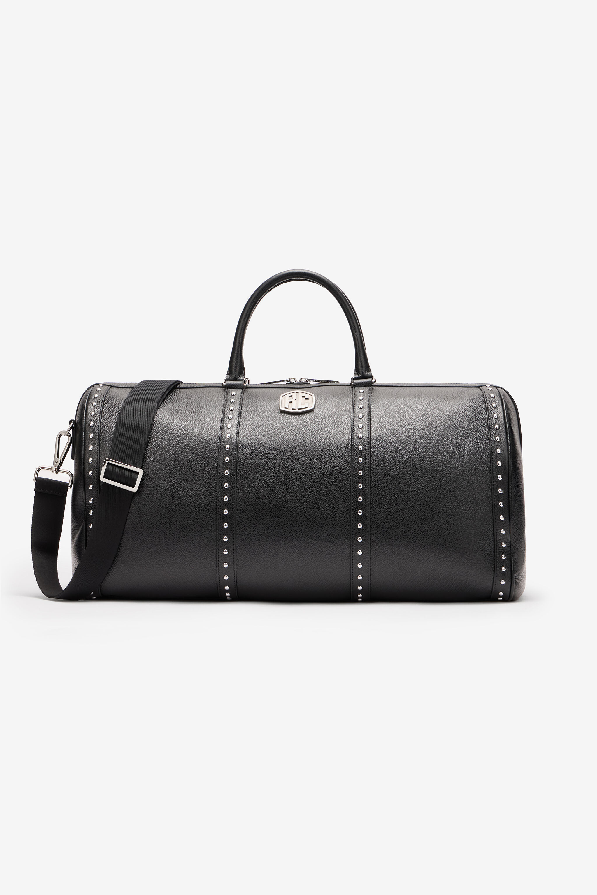 ID: VRB009-PZB05-05051 Perfect for those who love to flaunt a rock style, this travel bag by Roberto Cavalli is crafted from tumbled leather and embellished with four vertical rows of studs on both the front and back. The accessory, characterized by an elongated shape and a spacious design, is completed by the metallic RC monogram on the front and can be carried in two ways thanks to the convenient top handles and the practical removable ribbon shoulder strap. Details - Tumbled leather travel bag - Four rows of studs on the front and back - Metallic RC Monogram on the front - Spacious design - Two top handles - Adjustable tape shoulder strap that can be removed with the clasps - Two-way zipper fastening on the top - Interior wall pocket with zipper